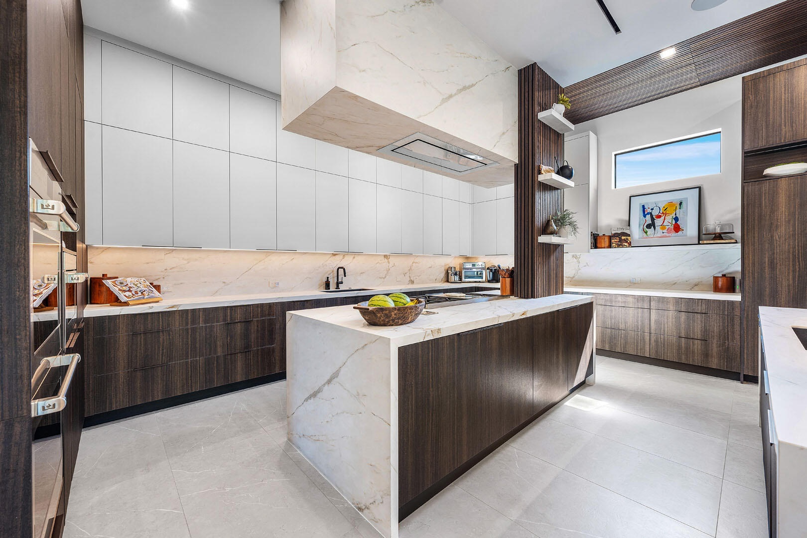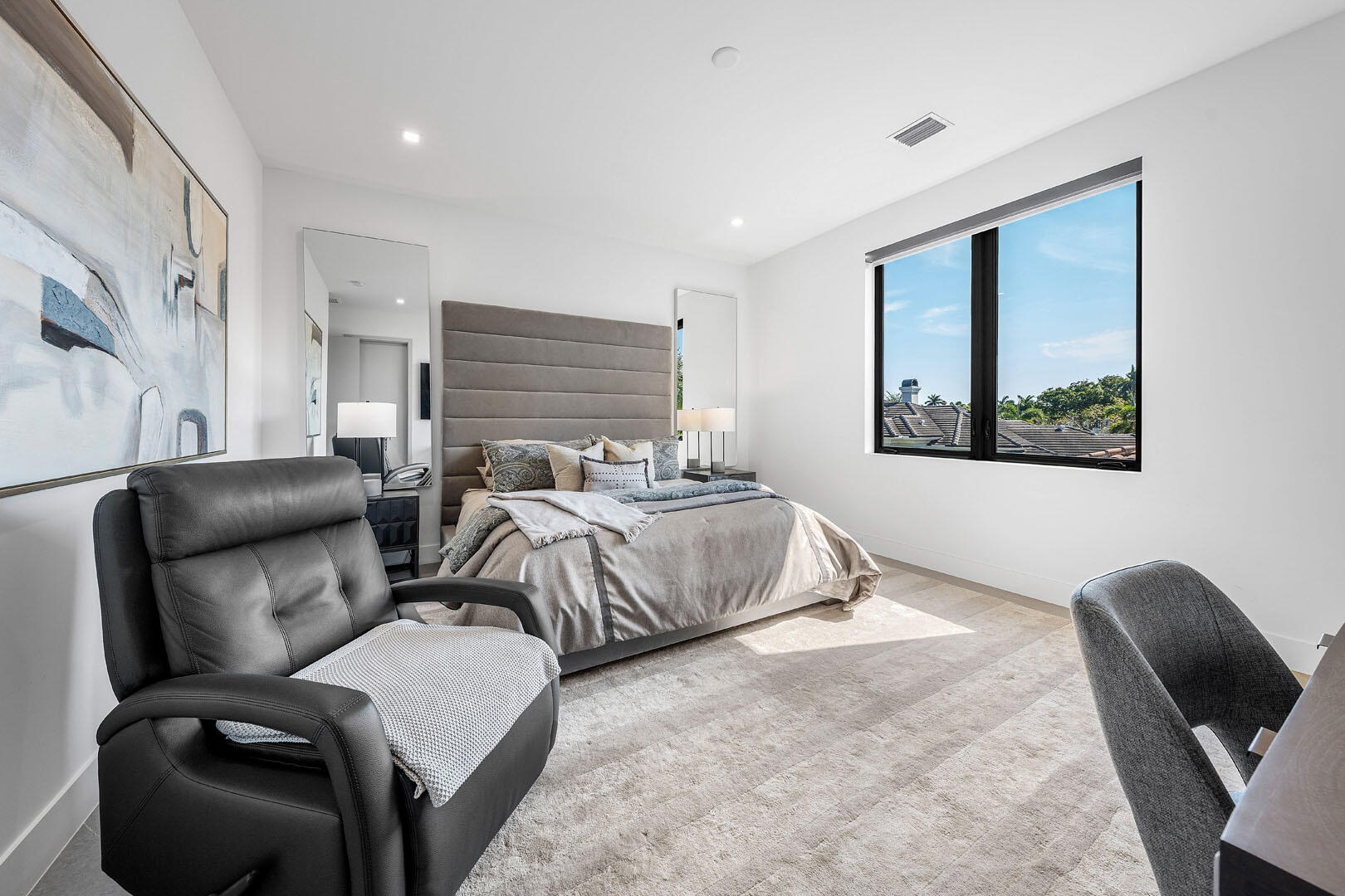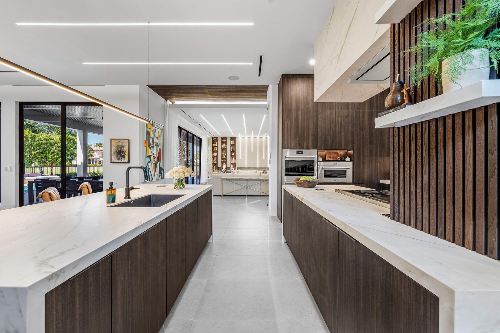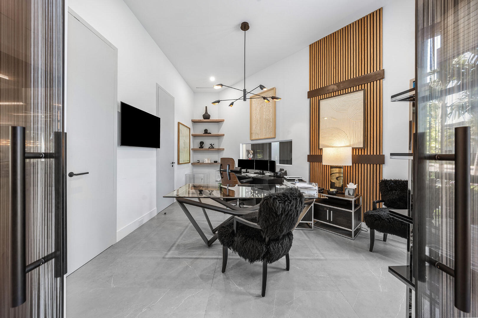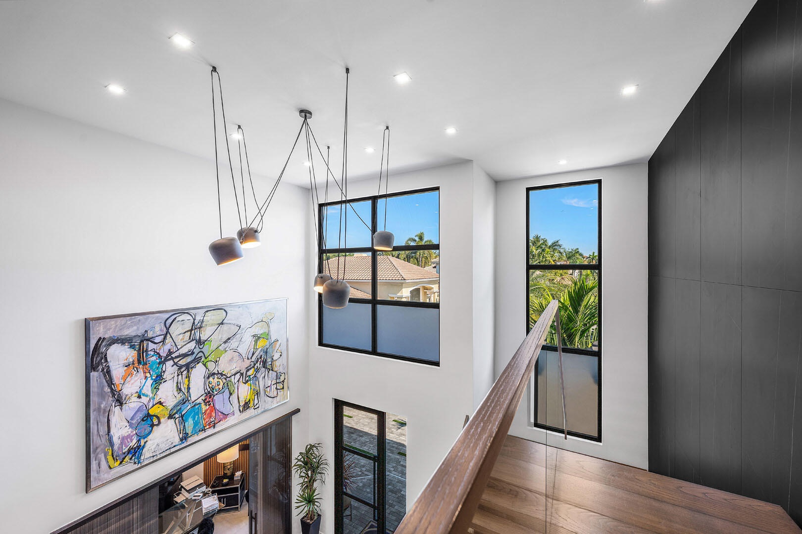 Welcome to 117 Thatch Palm Cove, located on the quietest cul-de-sac street in the prestigious Royal Palm Yacht & Country Club. Built in 2023 by Primo Construction, this golf course estate offers 165 feet of prime golf frontage with sweeping views of a serene pond and the Jack Nicklaus signature golf course, and features over 7,700 square feet of luxurious living space with 5 bedrooms, 6 baths, and a club room. Floor-to-ceiling glass brings in ample natural light and perfectly frames the tranquil water and golf views, creating a seamless connection between the chef's kitchen, family room, great room, and the resort-style outdoor area with heated pool, spa, covered seating, and lush landscaping. Additional highlights include a private putting green, full-house generator, and a three-car garage, one of which is an incredible show garage designed to showcase a prized automobile.