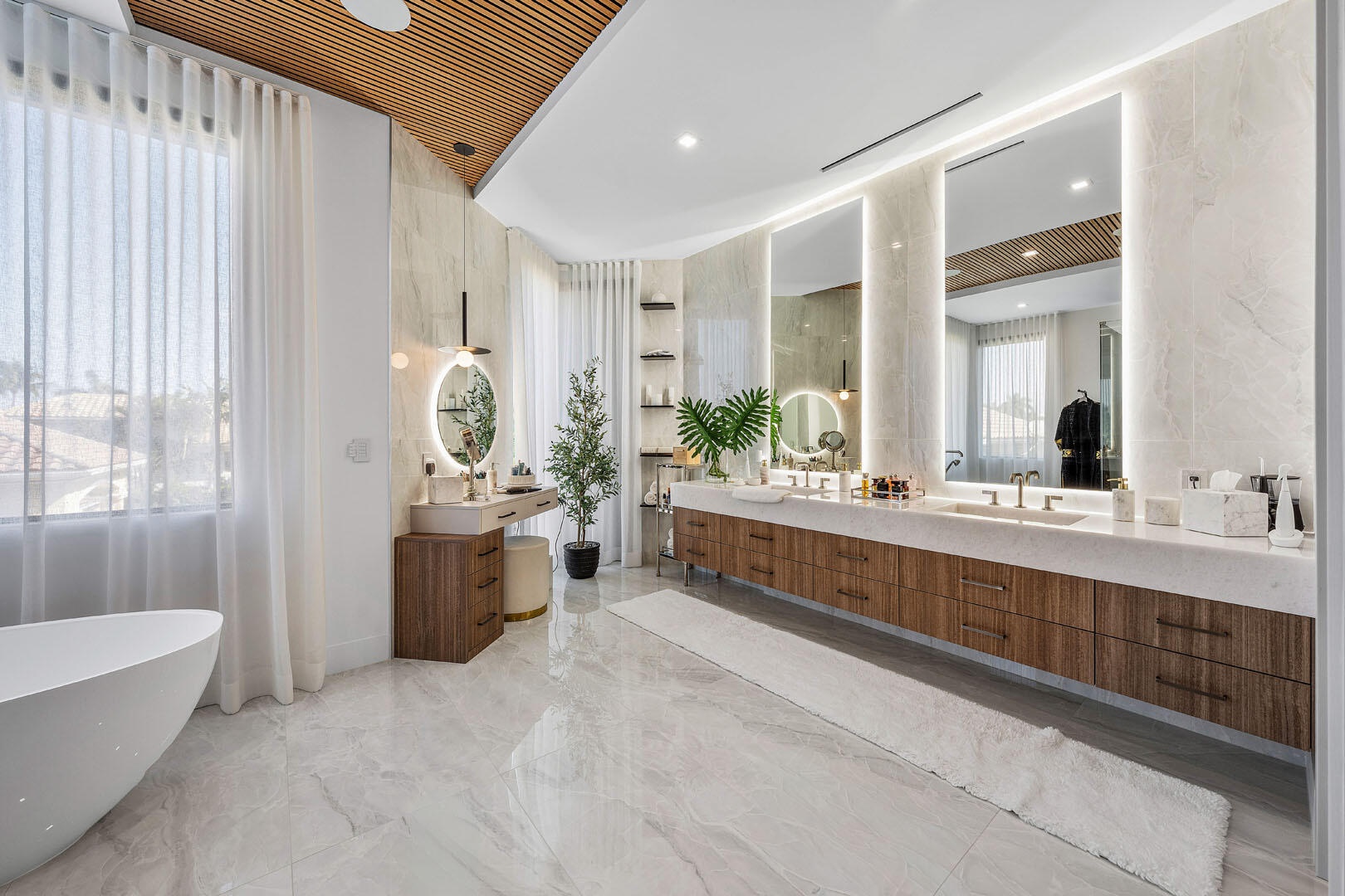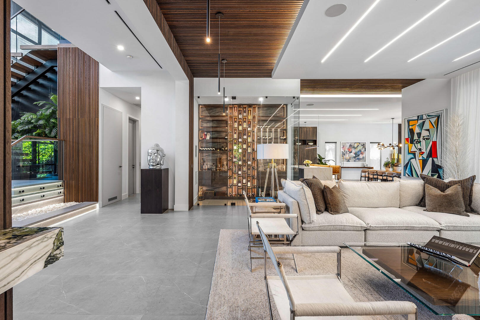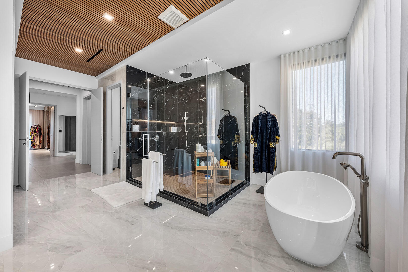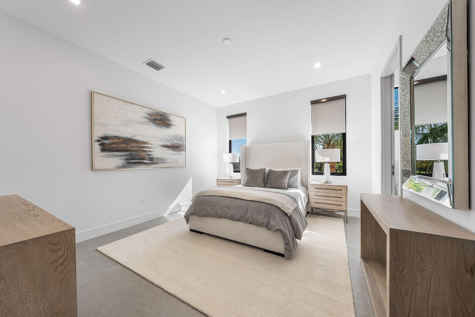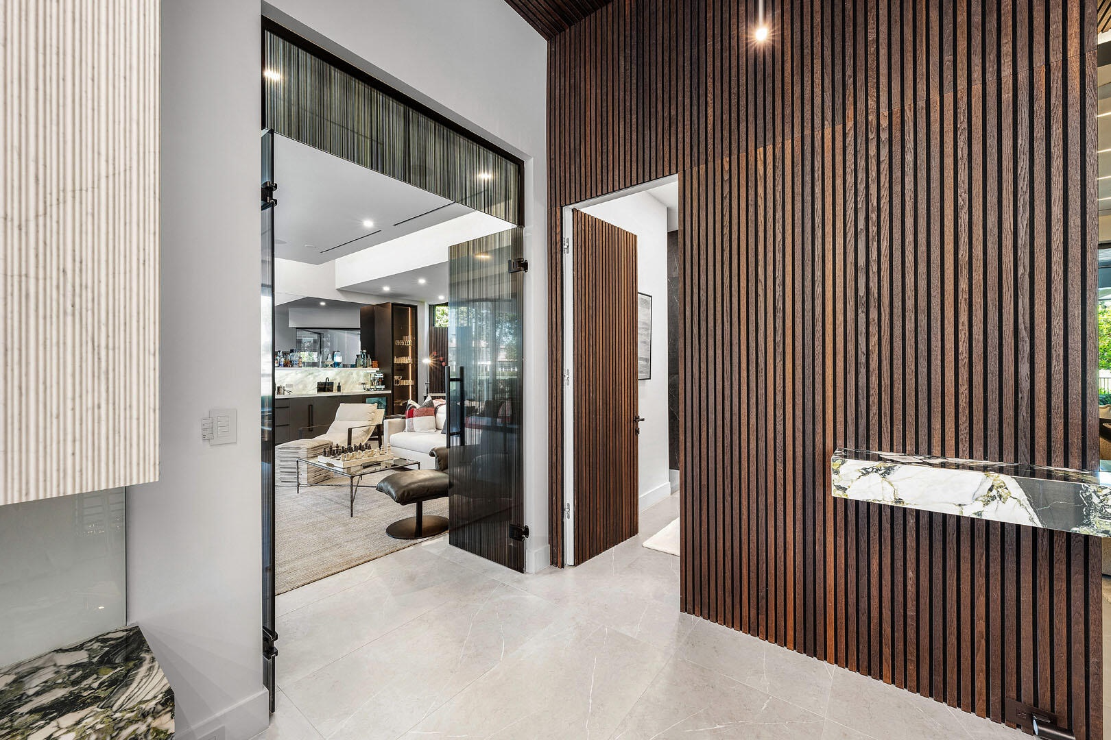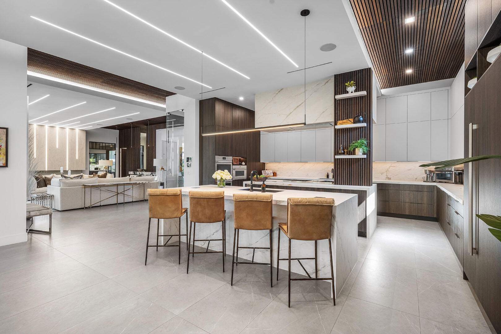 Welcome to 117 Thatch Palm Cove, located on the quietest cul-de-sac street in the prestigious Royal Palm Yacht & Country Club. Built in 2023 by Primo Construction, this golf course estate offers 165 feet of prime golf frontage with sweeping views of a serene pond and the Jack Nicklaus signature golf course, and features over 7,700 square feet of luxurious living space with 5 bedrooms, 6 baths, and a club room. Floor-to-ceiling glass brings in ample natural light and perfectly frames the tranquil water and golf views, creating a seamless connection between the chef's kitchen, family room, great room, and the resort-style outdoor area with heated pool, spa, covered seating, and lush landscaping. Additional highlights include a private putting green, full-house generator, and a three-car garage, one of which is an incredible show garage designed to showcase a prized automobile.