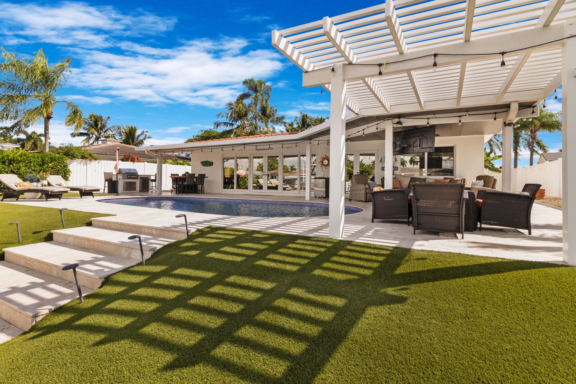 Welcome to this exquisite waterfront residence where luxury living meets modern comfort in one of Pompano Beach's most sought-after neighborhoods. Boasting 75 feet of prime waterfront, this fully remodeled 3-bedroom, 3-bathroom home embodies the ultimate South Florida lifestyle. Inside, the open-concept design blends sophistication and ease. Large impact glass windows fill the home with abundant natural light while providing peace of mind during storm season. The custom chef's kitchen is both stylish and functional, featuring Quartz countertops, a coffee bar, gas stove, and upgraded stainless-steel appliances—perfect for everyday living and entertaining. The primary suite offers a serene retreat with a spacious master bathroom that includes dual sinks, a private enclosed area for the toilet, and ample closet space. The office includes a built-in Murphy bed, offering flexible space for guests or additional living needs. Step outside to your private backyard paradise, ideal for entertaining or relaxing. Enjoy a sparkling pool overlooking a wide intersecting canal, a large covered patio, and low-maintenance pavers and AstroTurf that ensure effortless upkeep. With a 52-foot dock, 12,000-pound boat lift, and direct access to open water, boating, fishing, and sunset cruises are just steps away. The lush landscaping is accentuated by elegant evening lighting, creating a warm, inviting ambiance after sunset. Out front, an expansive circular driveway enhances both convenience and curb appeal. Perfectly positioned just minutes from the beach and near the future Pompano Beach Downtown district, this home offers both an exceptional lifestyle and strong investment potential. The new downtown will feature nine acres of green space, a central waterscape, and a vibrant, walkable community filled with shopping, dining, entertainment, and cultural events a transformative addition set to redefine the area and elevate property values.