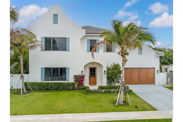 A stunning Dutch West Indies-inspired residence, thoughtfully designed and built to exceptional structural standards, showcasing exquisite custom details throughout. Created with both elegance and entertaining in mind, the open-concept floor plan features soaring ceilings, expansive living spaces, wide-plank oak flooring, and a gracious sense of scale. Ideally located just one block from the Intracoastal Waterway, this 4,443-square-foot home offers a luxurious first-floor primary suite complete with a marble-clad bath and two fully customized, boutique-style closets. Upstairs, three generously proportioned guest suites each with en-suite baths, are complemented by a versatile office or family room. The chef's kitchen is beautifully appointed with a Thermador six-burner gas range and premium appliances, Taj Mahal quartzite countertops, custom cabinetry, and a wine refrigerator—perfect for both everyday living and entertaining. Additional highlights include a two-car garage with ceiling height suitable for a lift, a resort-style pool with fountains and gas heater, full-house generator, hurricane-impact windows and doors, integrated Sonos sound system, and prewiring for cable and security. Every closet has been thoughtfully custom designed and installed. Perfectly situated near pristine beaches, acclaimed restaurants, Worth Avenue, scenic bike trails, and world-class golf courses, this exceptional home offers the best of luxury coastal living.