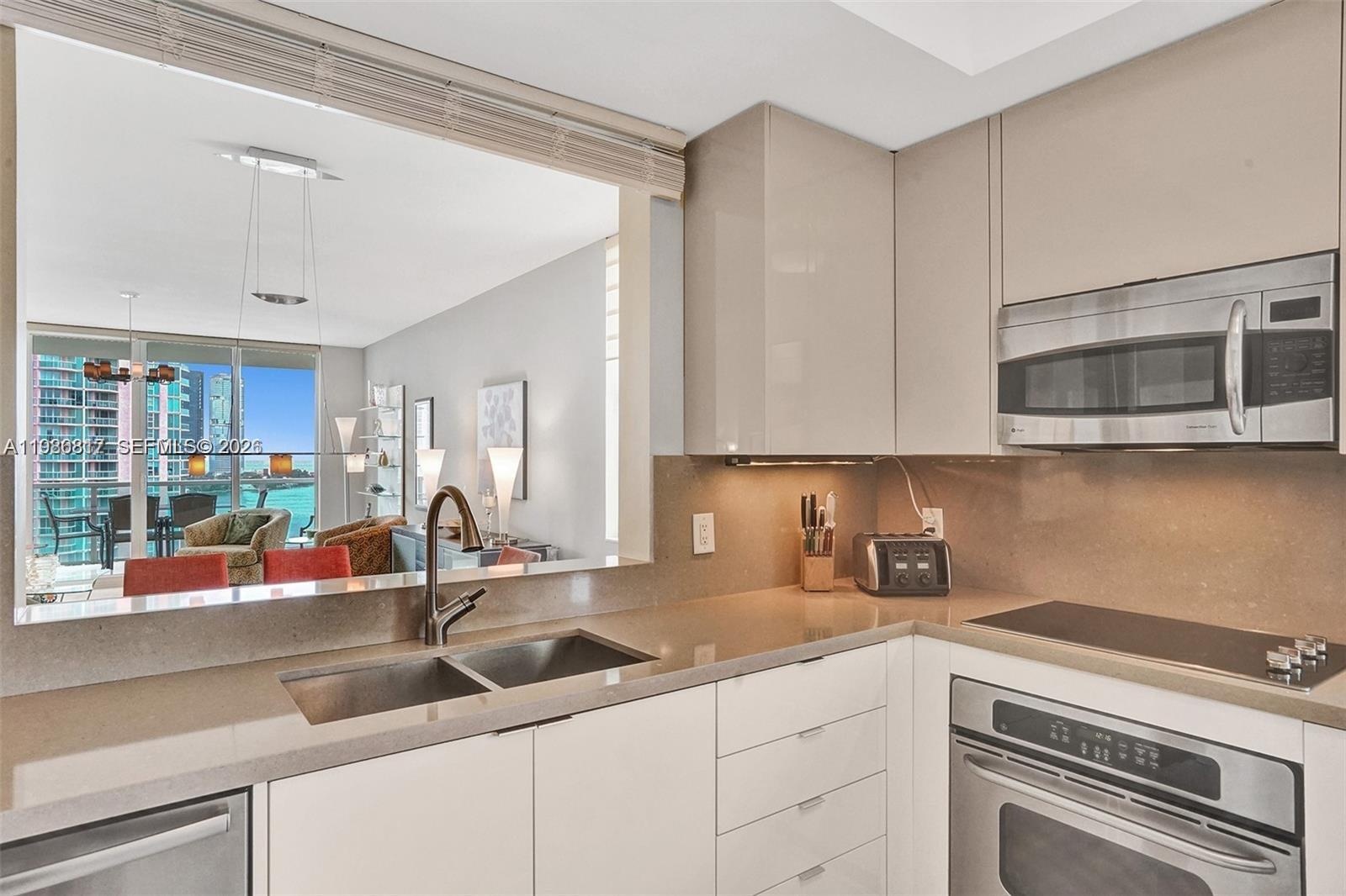 Breathtaking views of the open bay, the marina and the ocean directly from the 14th floor of Aventura Marina. Spacious corner unit with 2 bedrooms & a den, 2 full bathrooms, 1 half bath & a laundry room. Remodeled kitchen with modern cabinets, quartz countertop & porcelaine floor. You can see the ocean while cooking and entertaining your guests! The master suite also has beautiful waterviews, a separate bath tub & shower and a large walk-in closet. Tile floor throughout & full size washer and dryer inside the unit. comes with 1 garage space. Gated complex with security and resort style amenities. Valet, concierge, 2 pools, gym, spa, marina and clubhouse. Located near Aventura Mall, Turnberry Golf Course, Founders Park, grocery stores & restaurants. A-rated schools district. MUST SEE!