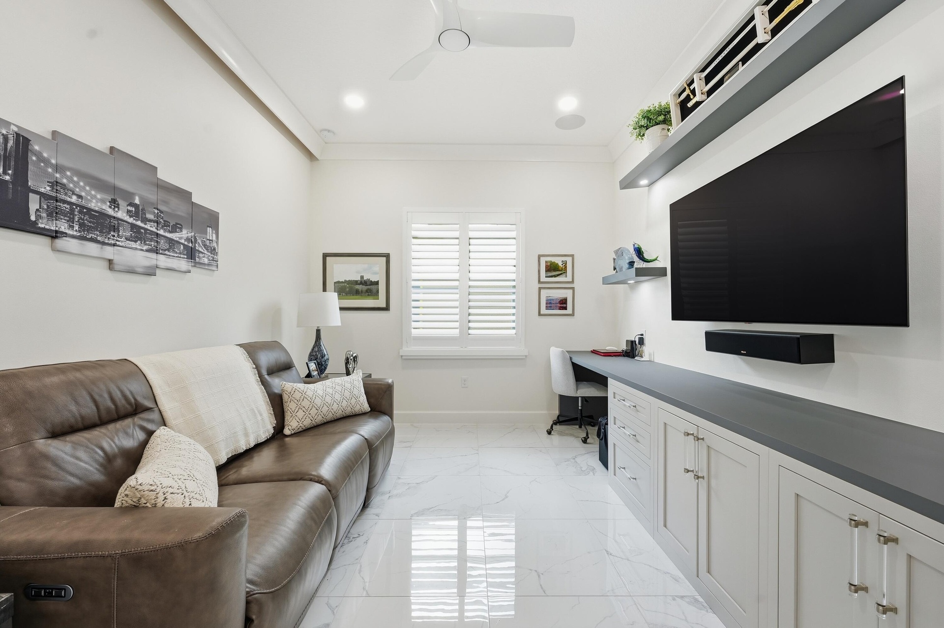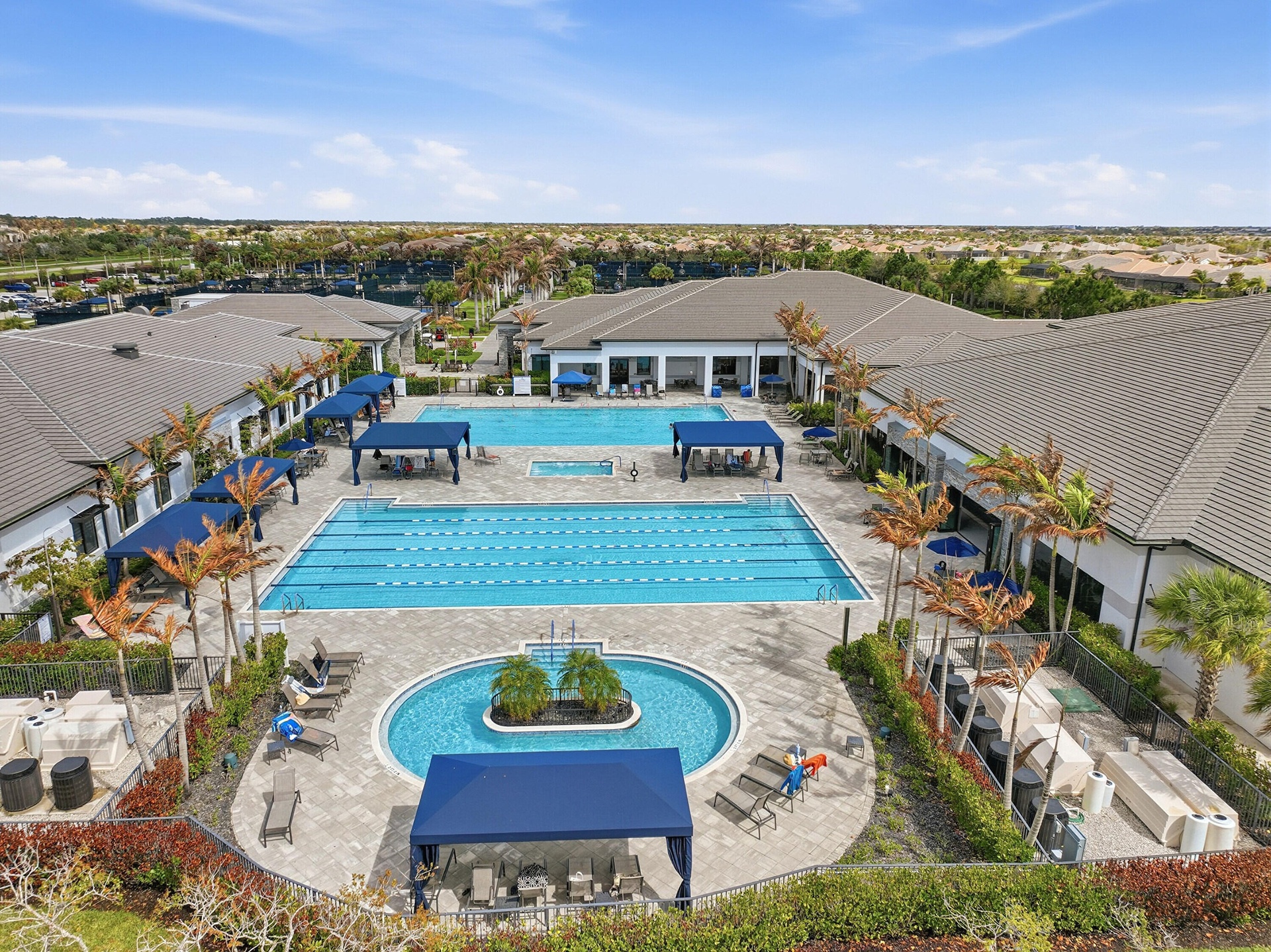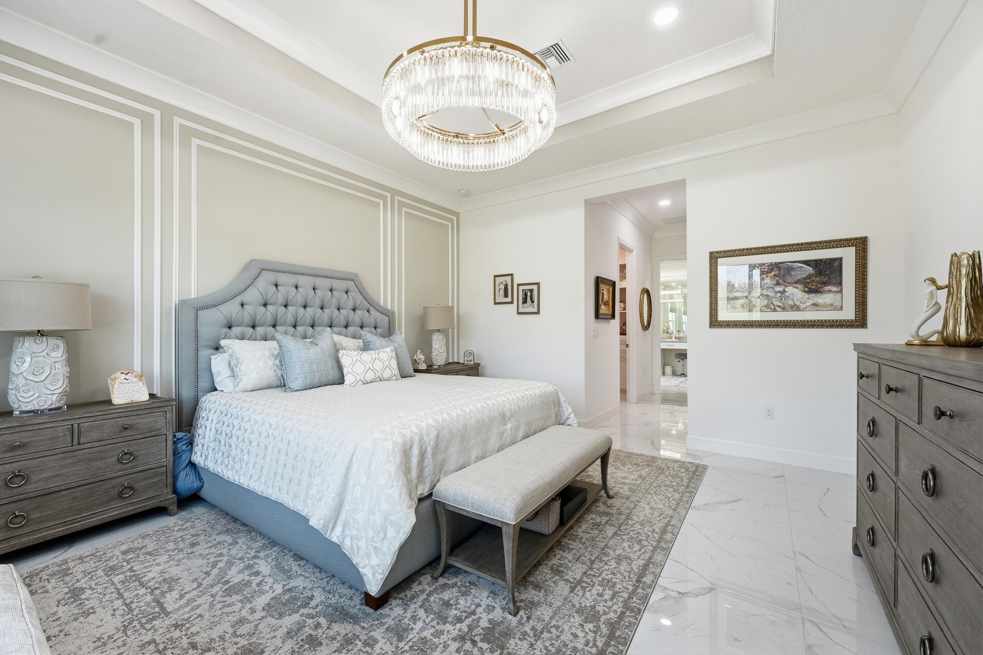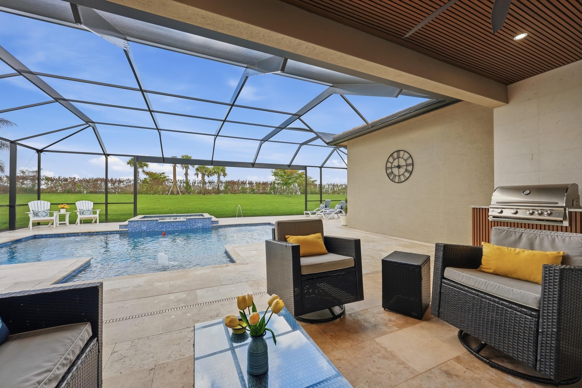 Discover a beautifully designed & professionally landscaped home that shows like a model. Enter into a grand foyer with luxurious faux-painted walls, soaring ceilings, continuous crown molding & sophisticated wallpaper with a polished modern tile flooring. This exquisite 3-bedroom, 3.5-bathroom home also features a versatile office & a full 3-car garage. Every detail has been thoughtfully considered, including a whole-house water filtration system. The open-concept floor plan flows seamlessly into a sleek white kitchen, boasting Level V cabinetry with pull-outs, under-cabinet lighting, a custom pantry, quartz countertops, a full-height marble backsplash & a center island perfect for both casual meals & formal entertaining. The primary bedroom offers elegance & views of a stunning heated pool and 6 person spa. Enjoy double walk in custom closets and a large en-suite bathroom. Two additional bedrooms are also en-suite. Open up those electric blinds to a seamless indoor-outdoor lifestyle, complete with a summer kitchen, gas heated pool & 6 person spa, under an expansive patio lanai with travertine tiles. Living in Valencia Grove means enjoying the full Riverland experience: world class amenities, vibrant social clubs, miles of pathways, and access to the 55+ lifestyle that makes this community so desireable. Easy access to major highways, beaches, fine dining, airports and medical facilities.