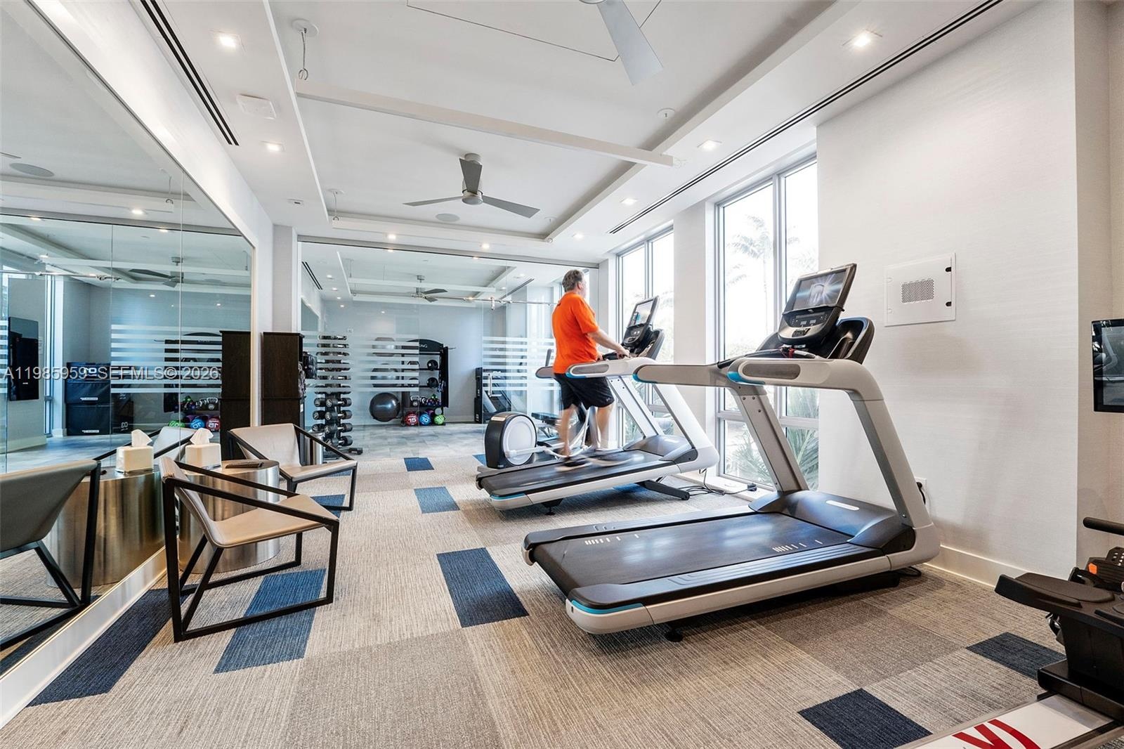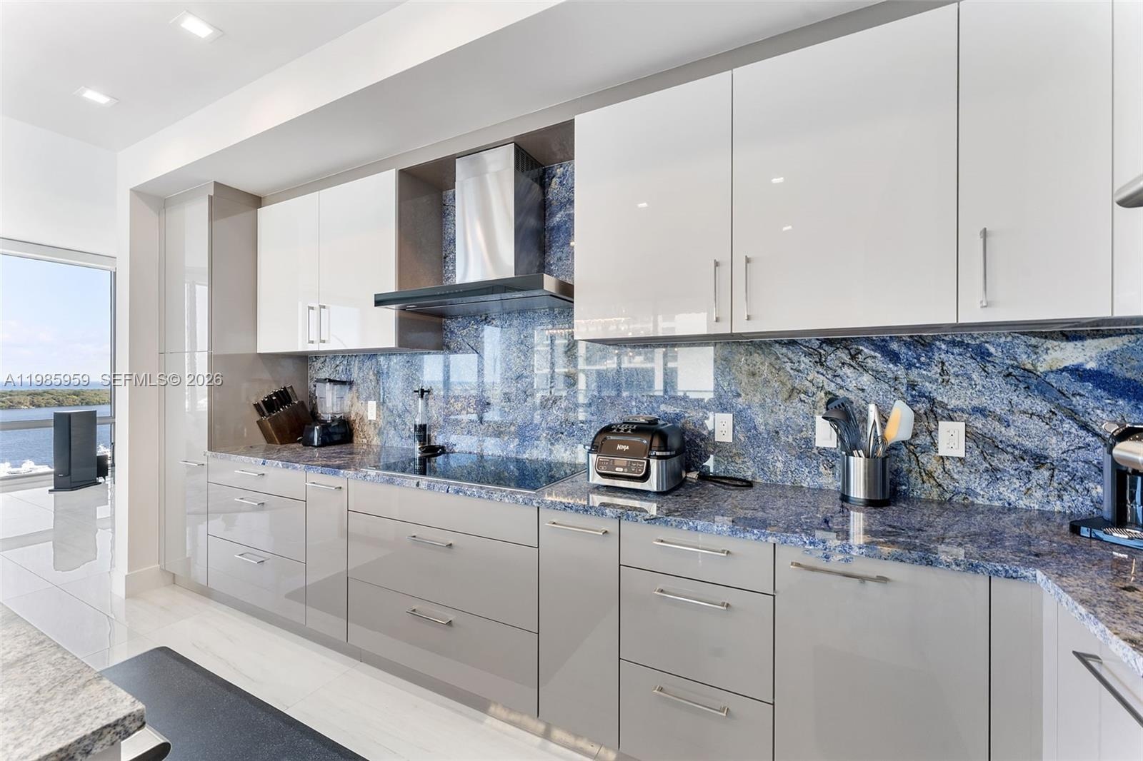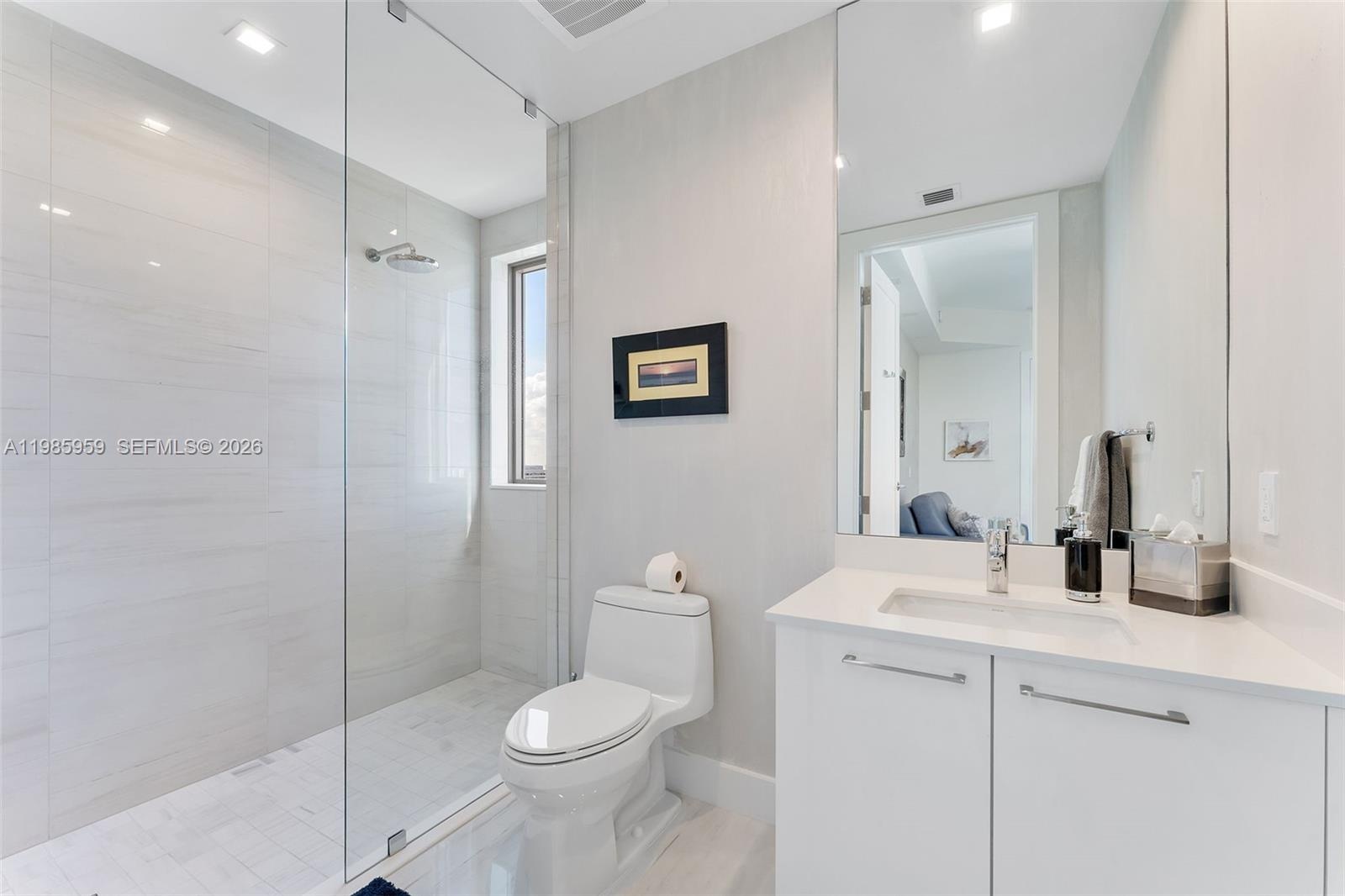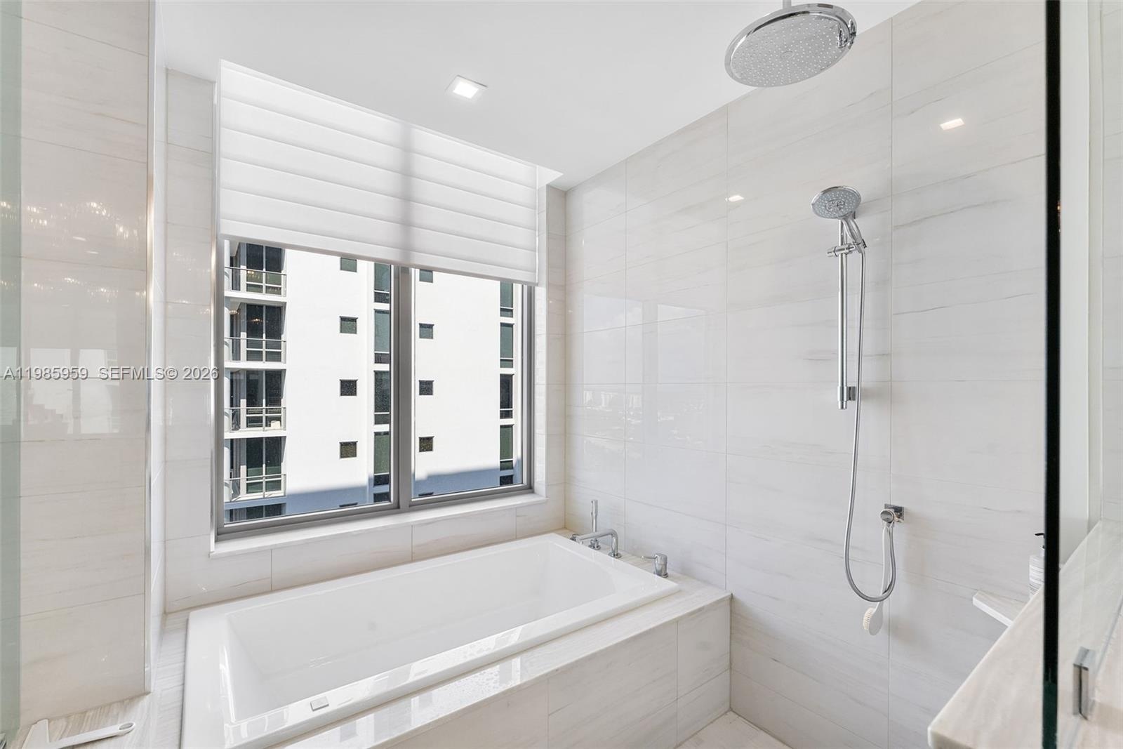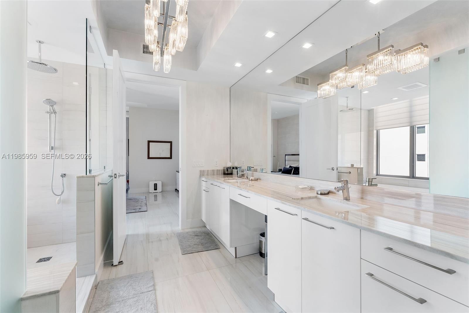 The chef’s kitchen is beautifully appointed with Jenn-Air appliances, an oversized island, and wine refrigerator, ideal for hosting. Porcelain flooring (24” x 48”) runs throughout, complementing spa-inspired bathrooms with rain showers, a Roman soaking tub, and top of the line designer finishings.