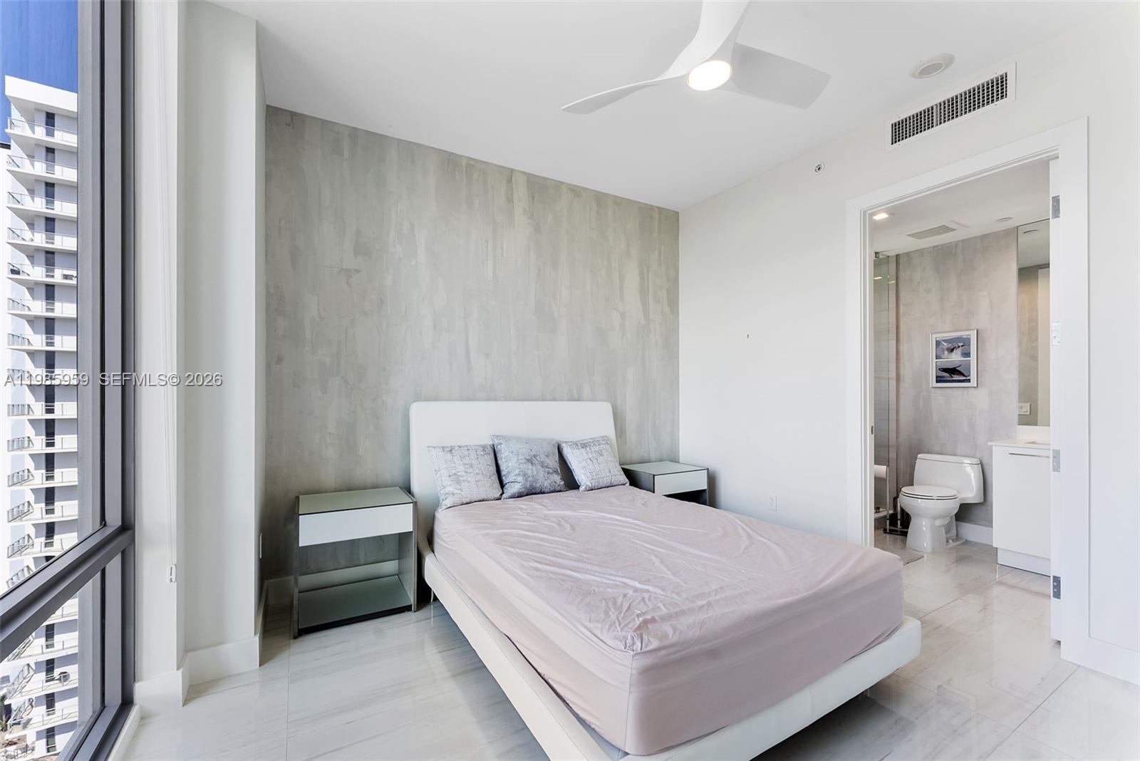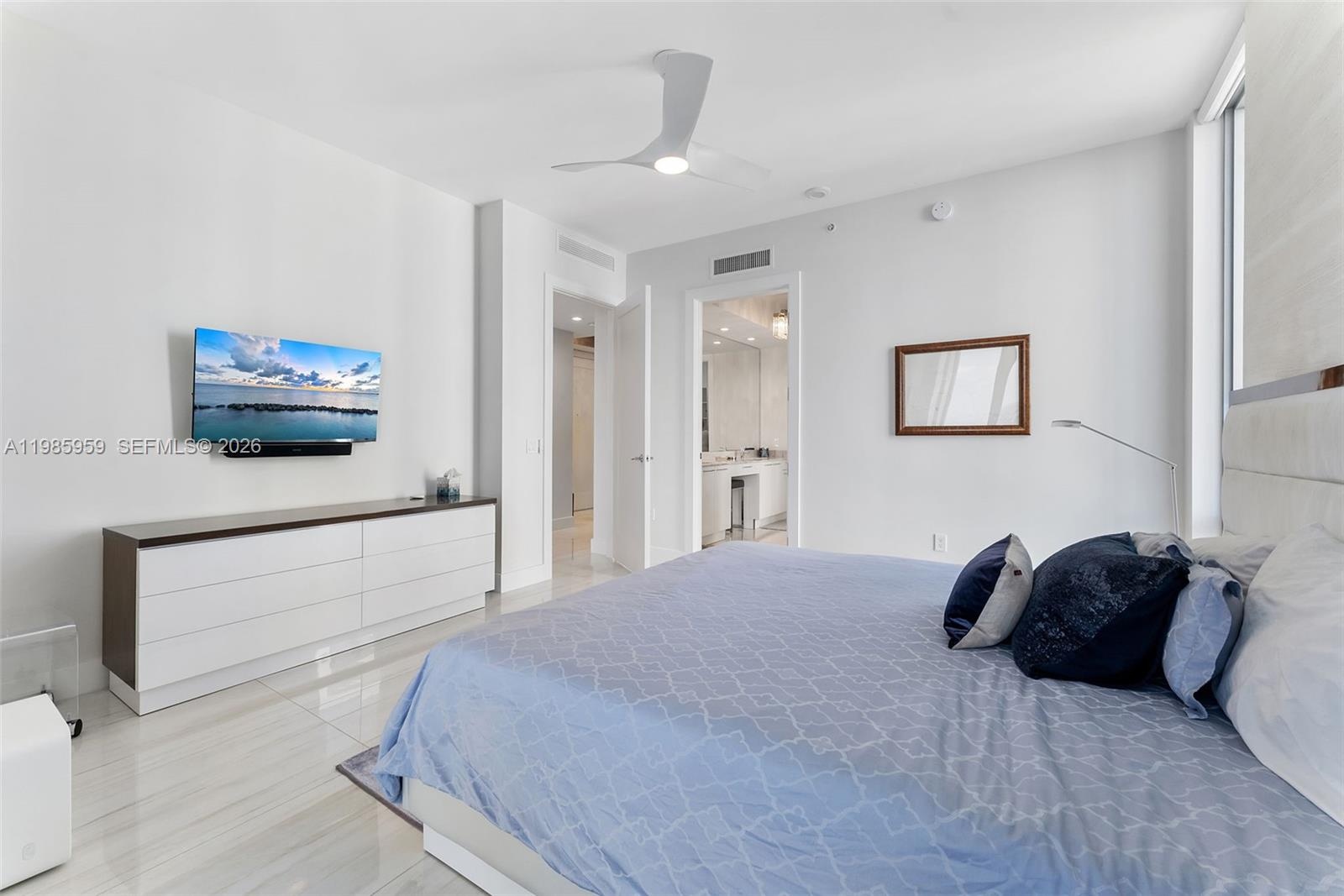 The master bedroom suite is elegantly furnished and features a spacious walk-in closet.