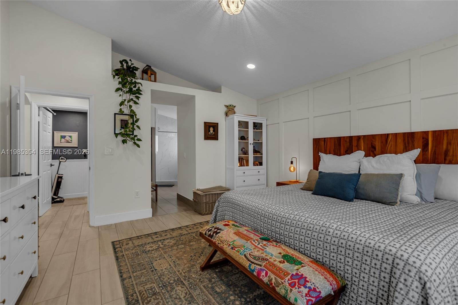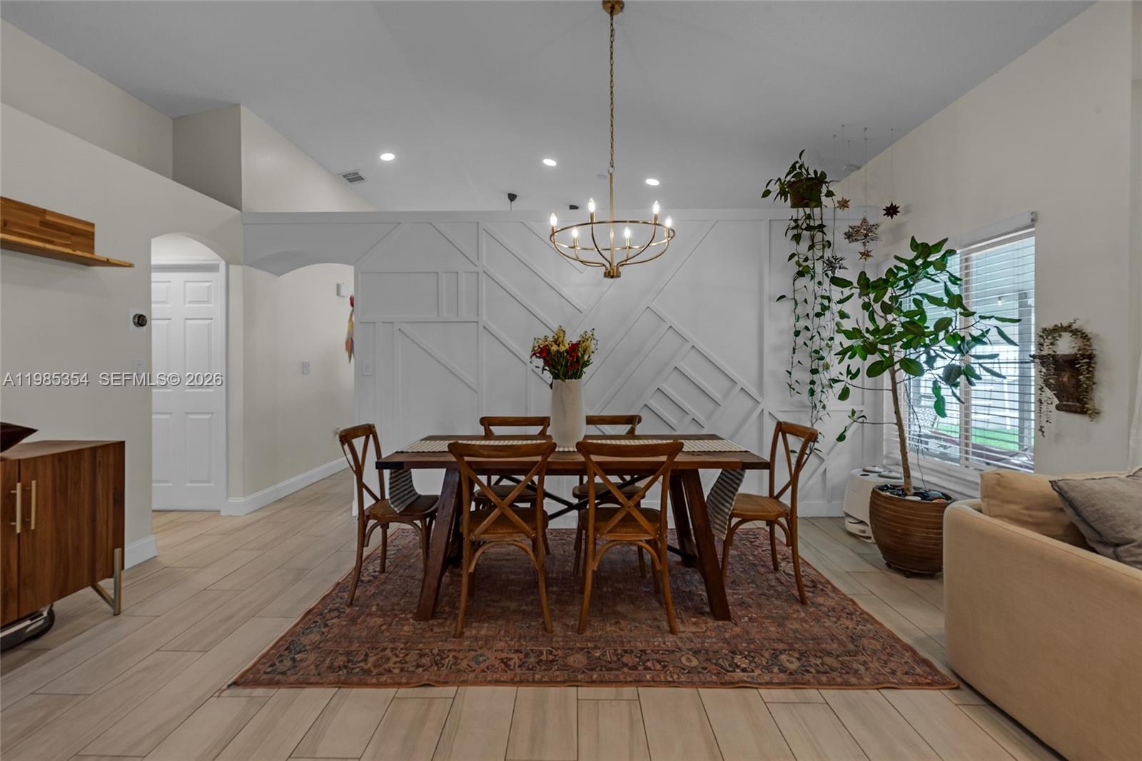 Step inside to discover an open-concept layout with soaring vaulted ceilings and wood-plank tile flooring throughout, creating a bright and modern living space. The spacious living and dining areas flow seamlessly to a screened-in porch and private fenced backyard—perfect for relaxing or entertaining.