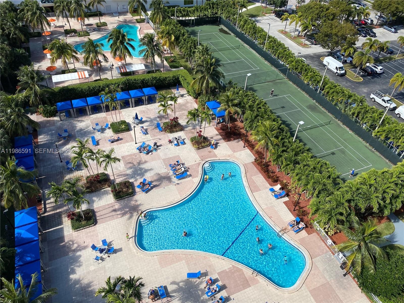 The unit features modern finishes and is move-in/rent-ready, perfect for immediate revenue generation. The building offers resort-style amenities including a heated pool, fitness center, tennis courts, on-site café, and convenience store—highly attractive features for short-term guests.