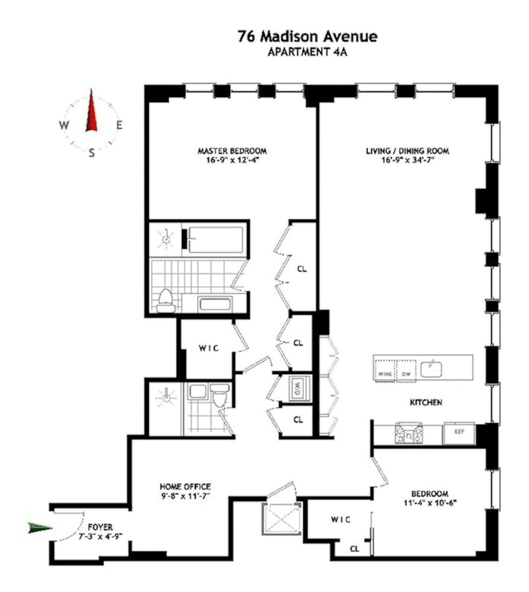 At the crossroads of NoMad and Flatiron, just one block from Madison Square Park, this exceptional two-bedroom residence with a large home office/library or guest room offers 1,769 square feet of sun-filled living with soaring 11-foot ceilings and a refined sense of scale.
