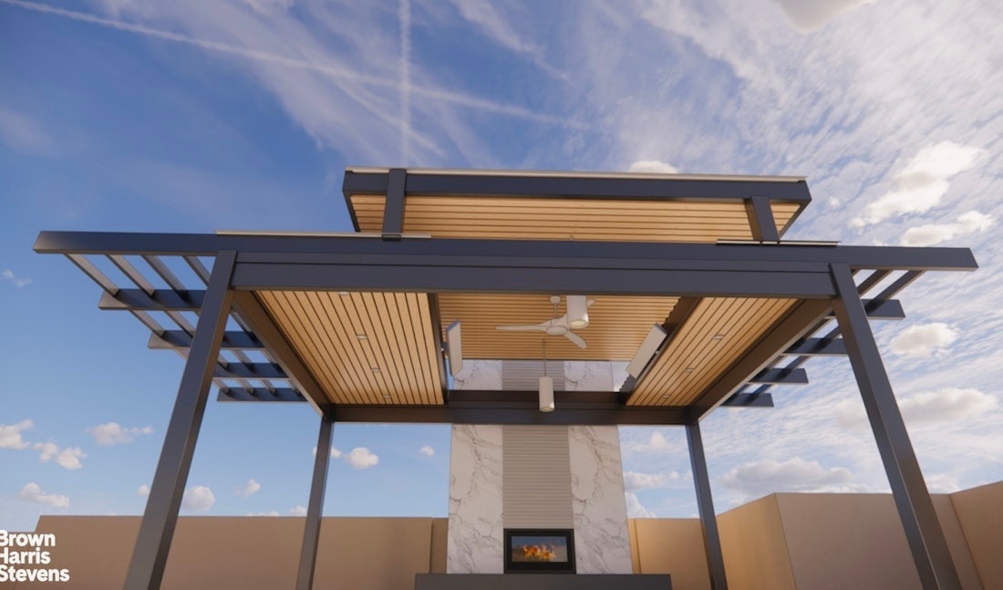 Landscaped roof terrace with fireplace, wet bar, and cinematic city and landmark views