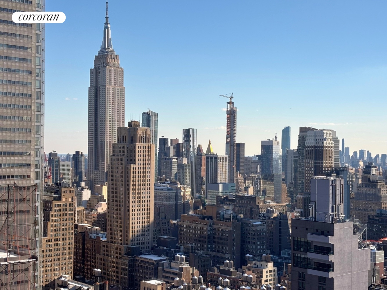 Welcome home to your castle in the sky! This 1-bedroom, 1-bath corner apartment is located on the 51st floor of the Orion Condominium, a luxury residential tower in Midtown West, located at 350 West 42nd Street. The E-line unit is the best in the building due to its panoramic eastern and southern exposures, which offer breathtaking views of the Hudson River and iconic city landmarks such as the Empire State Building, One World Trade Center, and Times Square. Floor-to-ceiling windows showcase unobstructed views of magnificent sunrises and sunsets.