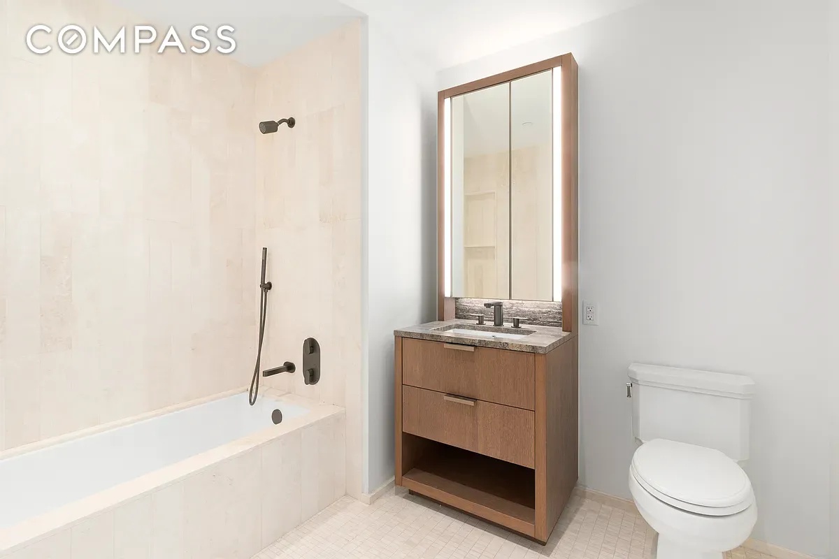 The bathroom offers a spa-like experience, finished in honed Windsor Cream marble and featuring a deep soaking tub, a separate glass-enclosed shower, and a custom oak and travertine vanity with elegant pewter fixtures.