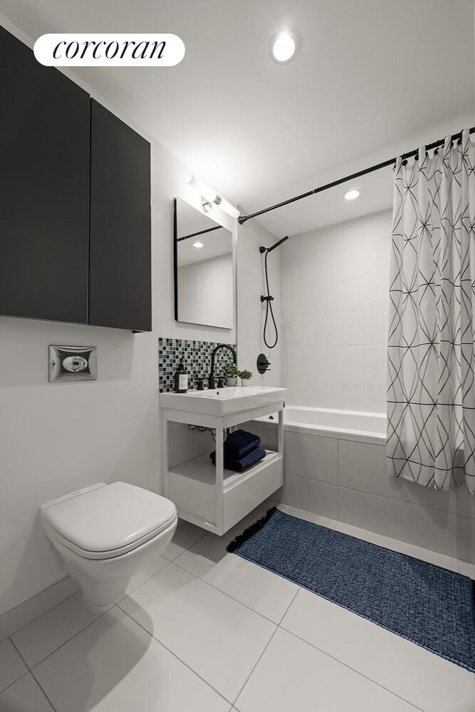 Just down the hall the main bath has a deep soaking tub and modern finishes and fixtures.