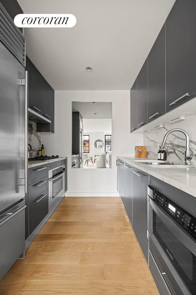 Off the living room, the kitchen has Ash cabinetry, marble countertops and backsplash, a Sub-Zero fridge, a Bosch Cooktop and range, a Faber range hood and plentiful storage space.