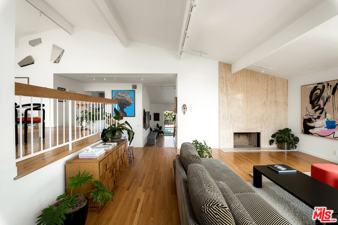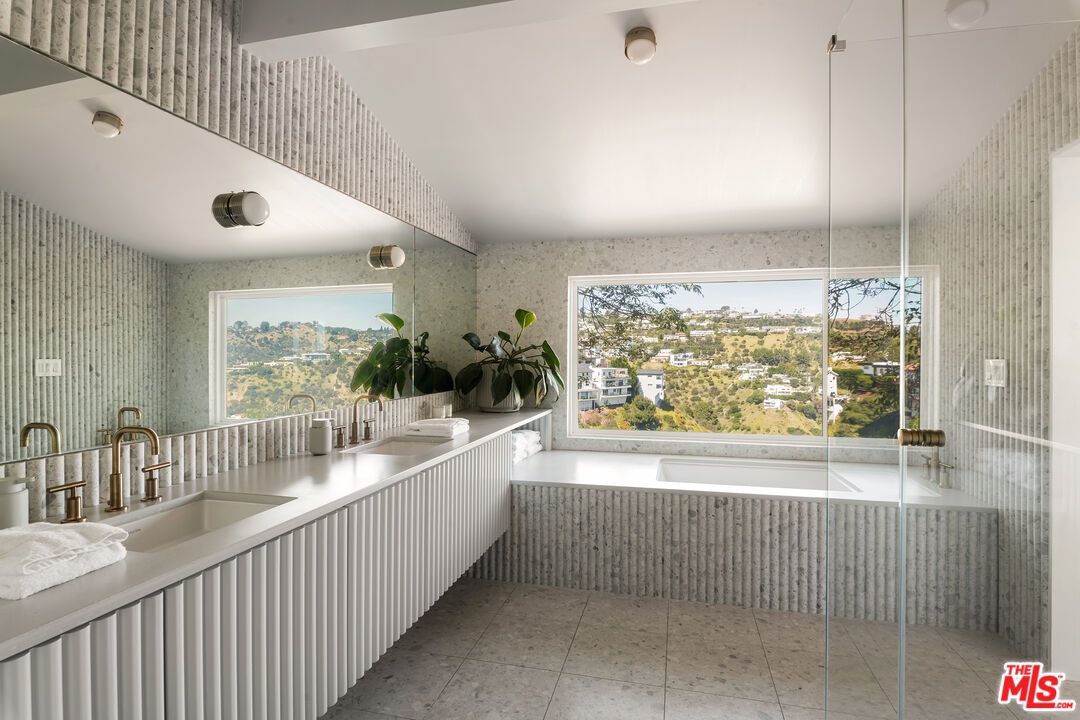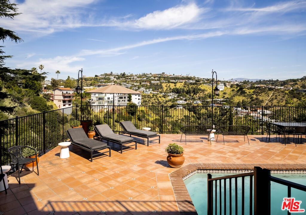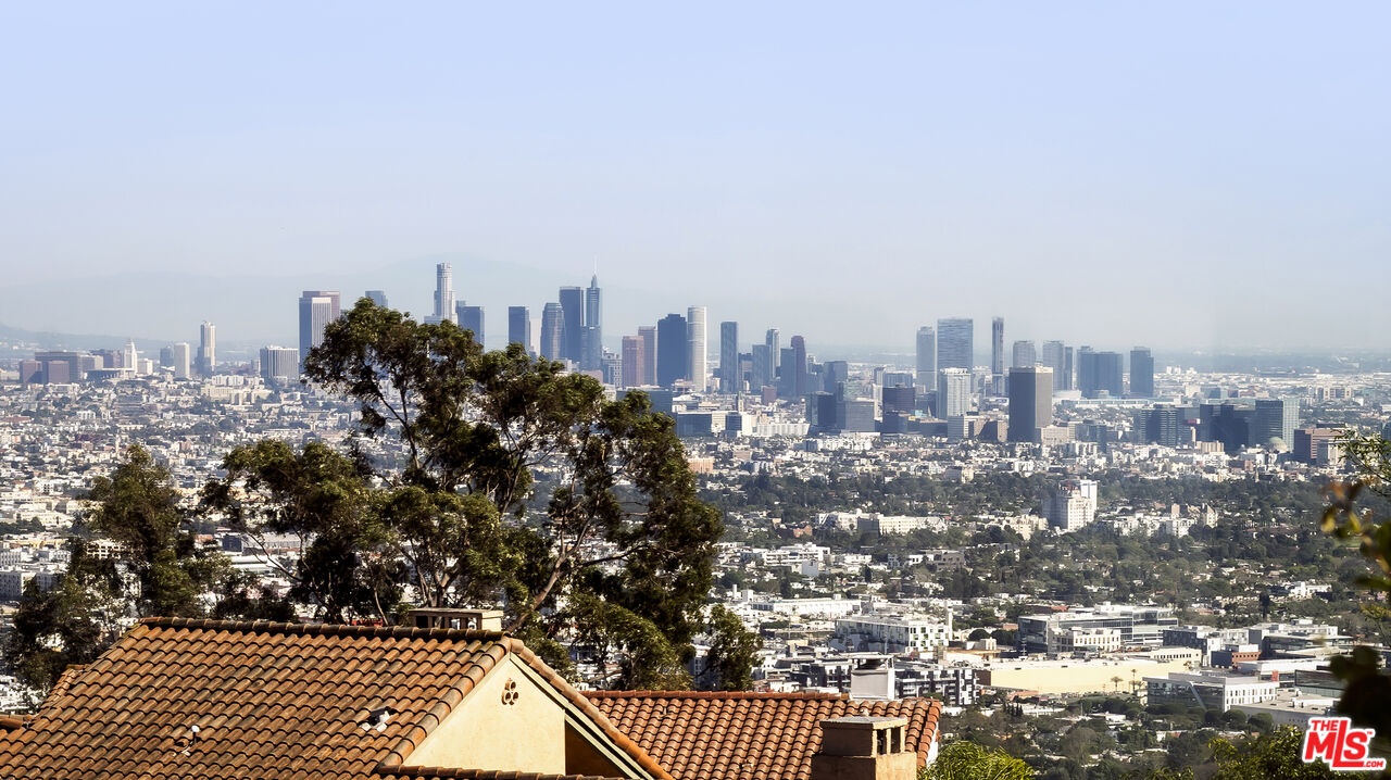 This nearly 4,000-square-foot Hollywood Hills retreat sits just above the Chateau Marmont with sweeping downtown skyline views from the front and expansive canyon views from the back. Tucked away on a quiet cul-de-sac just a three-minute drive to the Sunset Strip, the home offers rare privacy, all-day sunlight, a large pool, and an expansive entertaining deck - highly unusual at this price point. Completely redone through a multi-million-dollar designer renovation, the interiors feature Italian terrazzo, Kelly Wearstler tile and lighting, a lacquered Aran Cucine kitchen crafted in Italy with Miele appliances, Ann Sacks tile, and Nero Marquina marble countertops from Spain. Additional upgrades include custom cabinetry throughout, multi-function smart toilets with bidets, solid wood interior doors, and a custom walk-in closet in the primary suite. The light-filled main house features soaring ceilings, three huge bedrooms and two and a half baths, a grand eat-in kitchen with island, a spacious den/TV room, and a striking living room - both with fireplaces and commanding views - along with a formal dining room overlooking city lights. A completely private ADU, currently configured as an office and gym, includes a remodeled kitchenette, bath with steam shower, hardwood floors, and a wraparound deck with canyon views. It has previously generated rental income. Beautifully landscaped and professionally lit, the property also features an upgraded electrical panel supporting two EV fast chargers in the two-car garage. Located in an area experiencing significant investment - with several recent sales over $20M and multiple large-scale projects underway - this is a rare opportunity to own a fully renovated home on one of the Hills' quietest streets, known for some of the most spectacular views in the city. A turnkey offering with huge views, chic interiors, and significant upside potential.