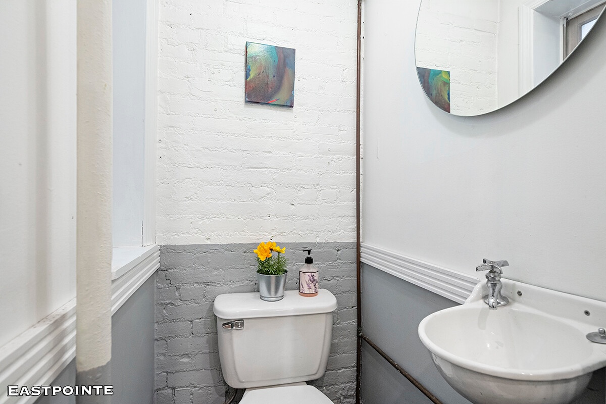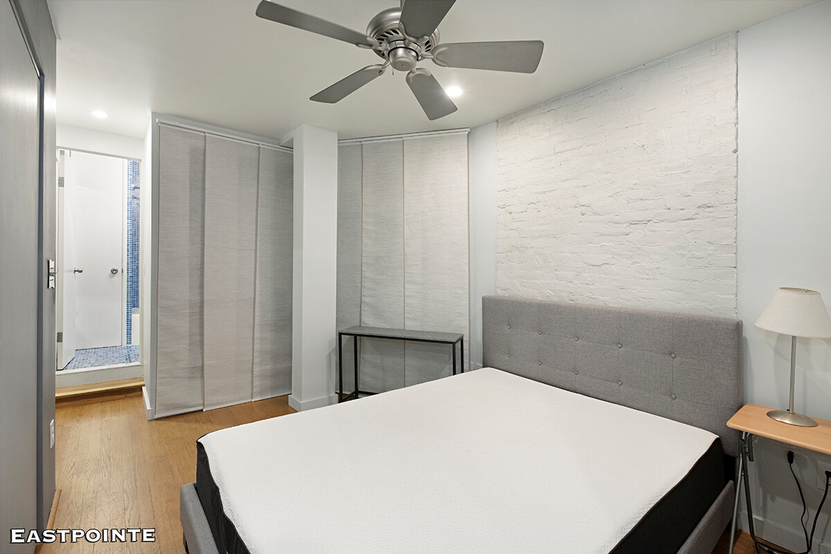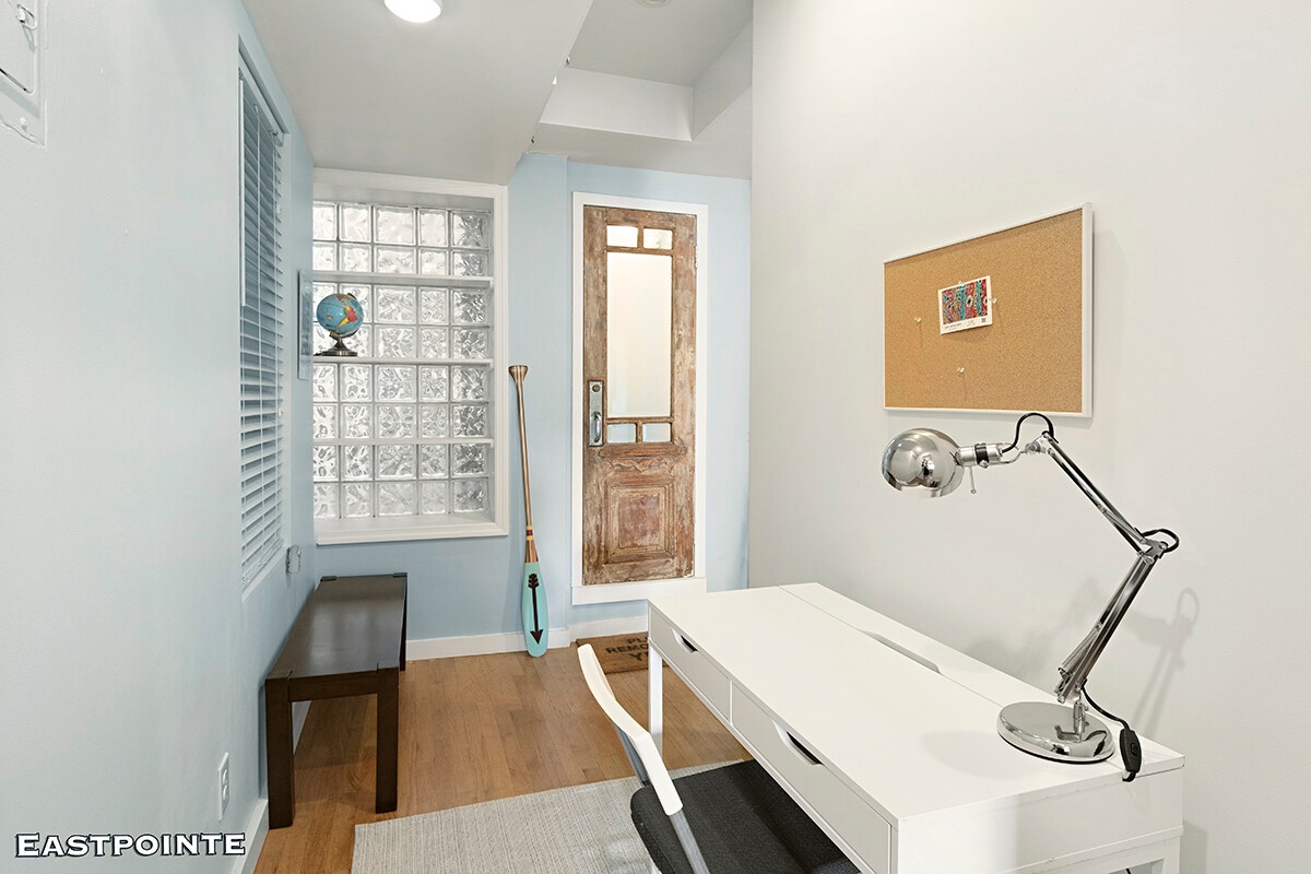 A true gem, this charming one-bedroom, one-and-a-half-bath residence with space for a study or a guest bedroom is both inviting and stylish, filled with natural light and character. The home features four oversized windows, airy 9+ foot ceilings, elegant hardwood floors, exposed brick walls, and generous closet space throughout. Windowed bathrooms and a thoughtfully designed layout further enhance the apartment's bright and comfortable living space.