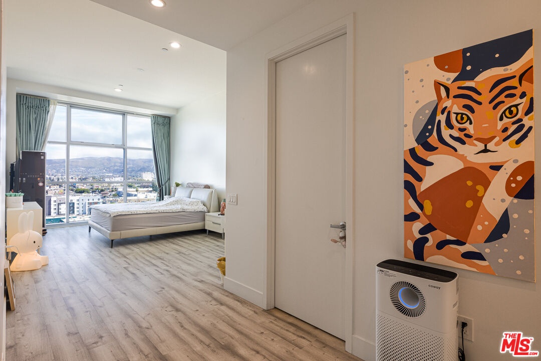 Discover stunning views in this elegantly designed north-facing unit at the prestigious Summit on Sixth high-rise. Revel in the expansive private balcony offering sweeping sights of the famous Hollywood Sign and Griffith Observatory, visible from both bedrooms and the living area. this 2-bedroom, 3-bathroom open-concept home is filled with natural light, showcasing luxurious and tasteful renovations that make it truly unique within the building. The gourmet kitchen features new premium appliances, modern cabinetry, and a marble countertop, ideal for hosting guests. The spacious primary suite includes a walk-in closet, a large tub, a walk-in shower, and dual vanities. The secondary bedroom also has an en suite bathroom with a walk-in shower and closet. This exclusive building offers top-notch amenities, a package retrieval and tracking system, a gym, a sauna and an indoor golf simulator. The unit includes two designated underground side-by-side parking spaces, complete with an EV charger. Situated in the heart of Korea town, you're just steps away from a variety of restaurants, grocery stores, the Metro Station and much more.