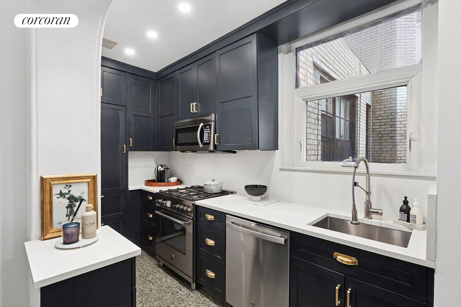 - Full gut-renovated kitchen: navy shaker cabinetry to ceiling, brass hardware, gas range, terrazzo floors