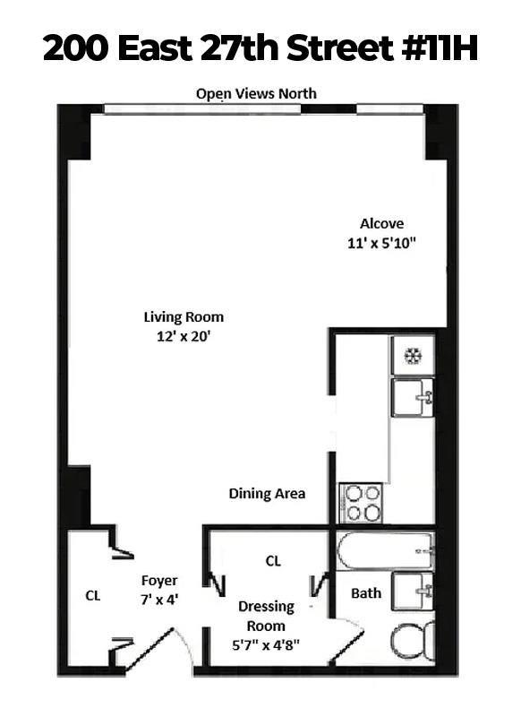 Bright, oversized alcove studio at 200 East 27th Street 11H The Victoria House with open northern views, excellent storage, and a layout that truly supports everyday Manhattan living.