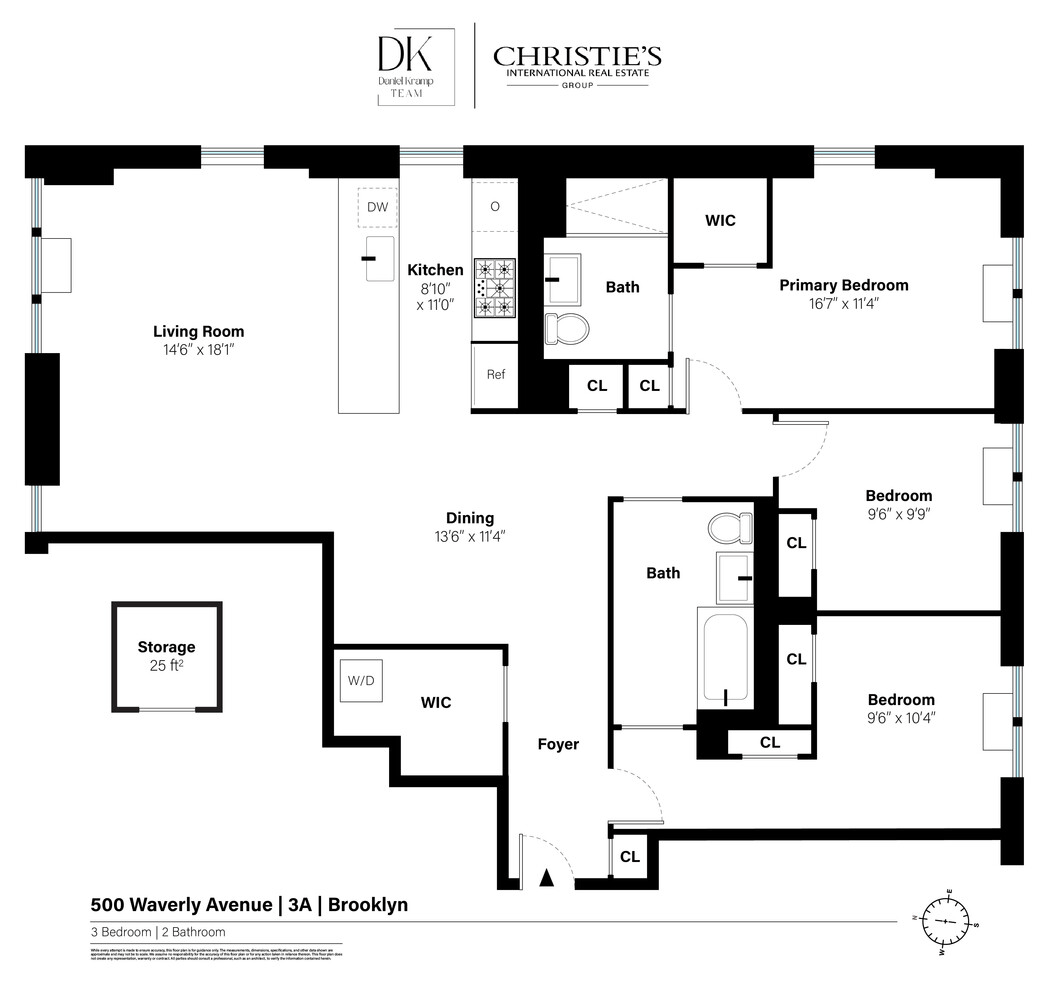 Residence 3A at 500 Waverly Avenue is a 1,419-square-foot, three-bedroom, two-bathroom condominium offering a highly efficient layout, excellent natural light, and the benefit of a tax abatement through 2042, along with a deeded storage unit.