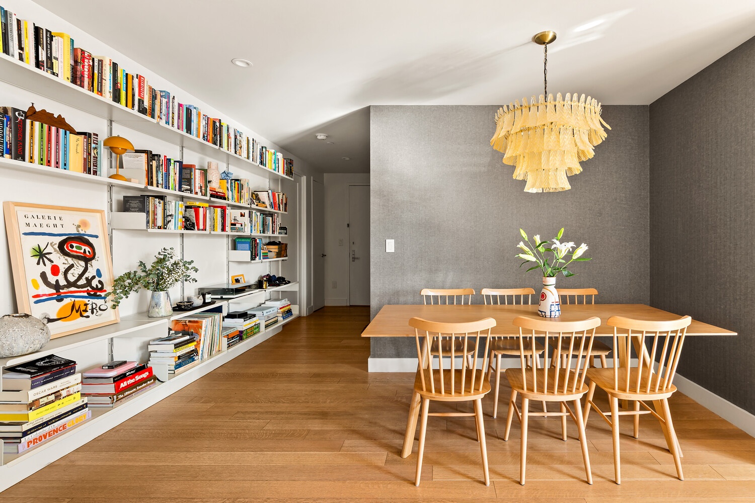 A spacious living and dining area is framed by oversized windows and finished with wide-plank oak flooring throughout. The open chef's kitchen is anchored by a large island with seating and storage, and features custom oak and white lacquer cabinetry, honed quartz countertops, and a full suite of appliances by Bosch, Bertazzoni, and Liebherr.