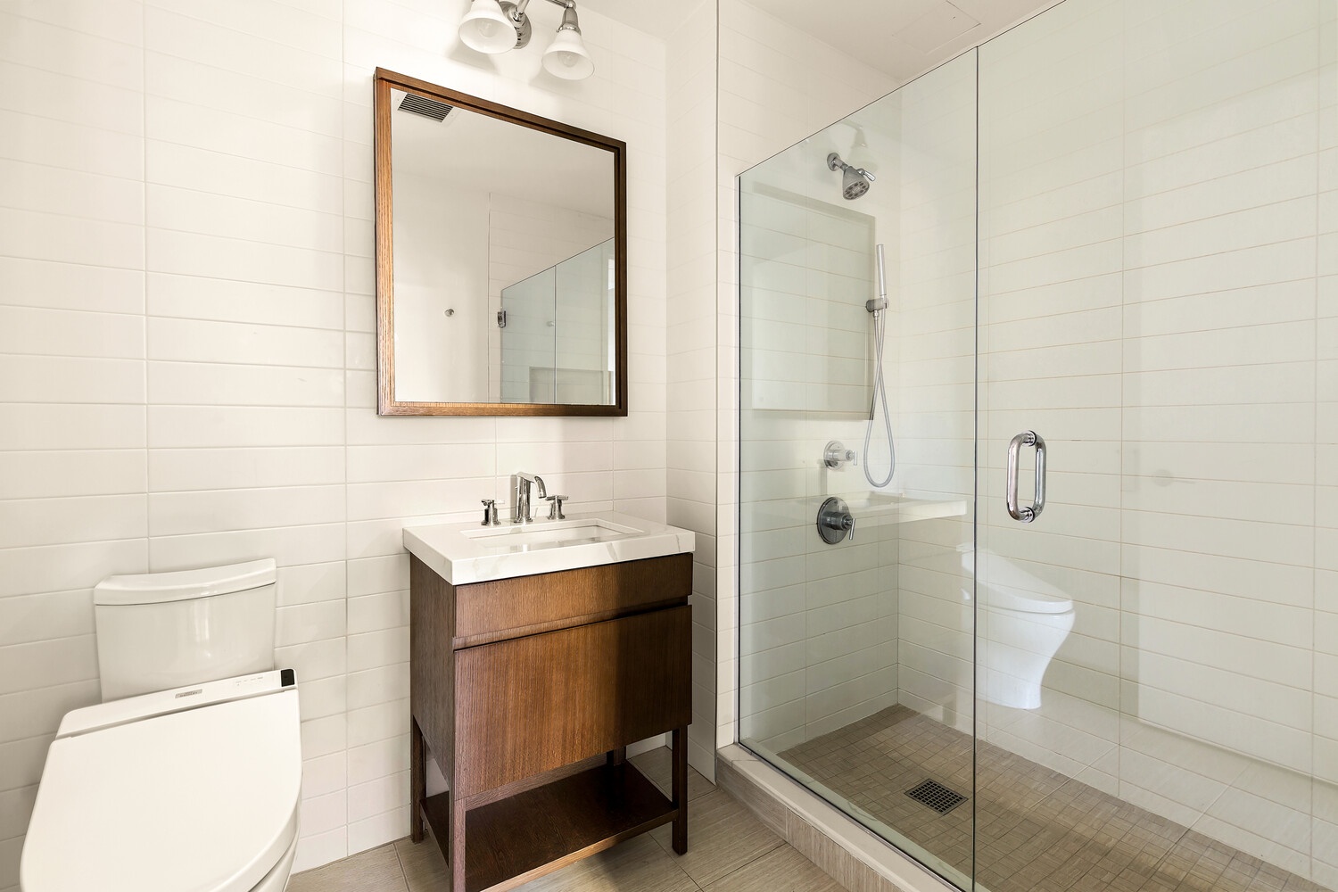 The primary suite is privately positioned with a walk-in closet and en-suite bath, while two additional bedrooms offer flexibility for guests, home office, or additional living space. Bathrooms are finished with Italian porcelain tile, custom vanities, and glass-enclosed showers.