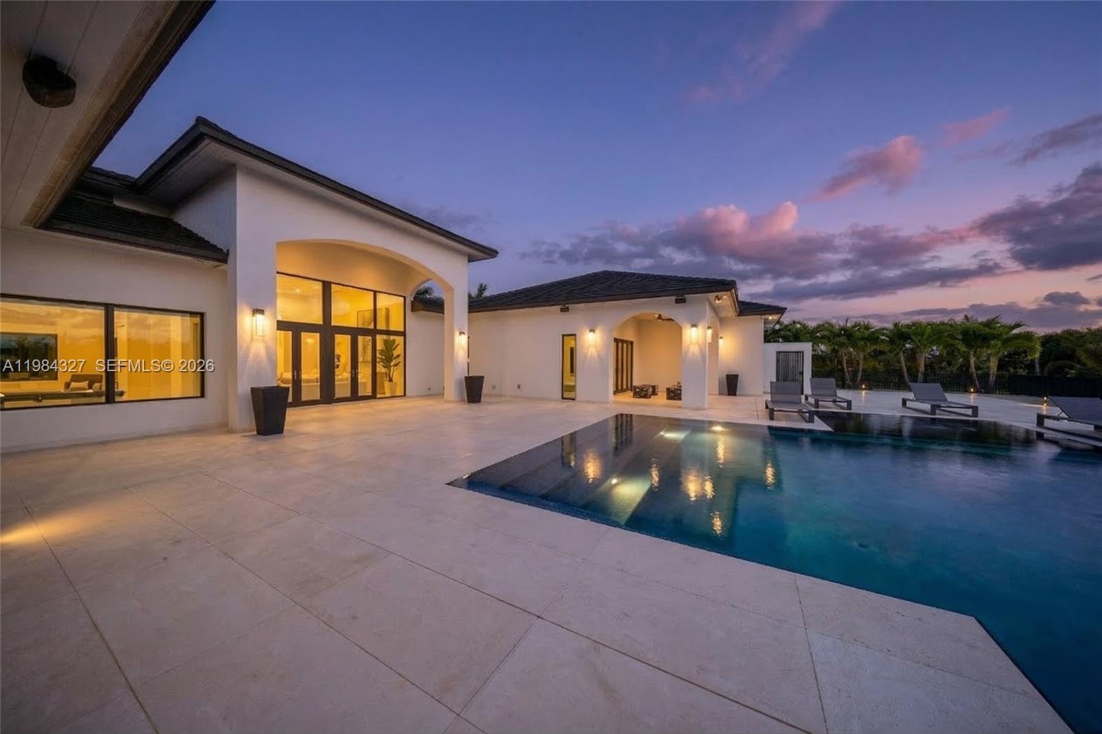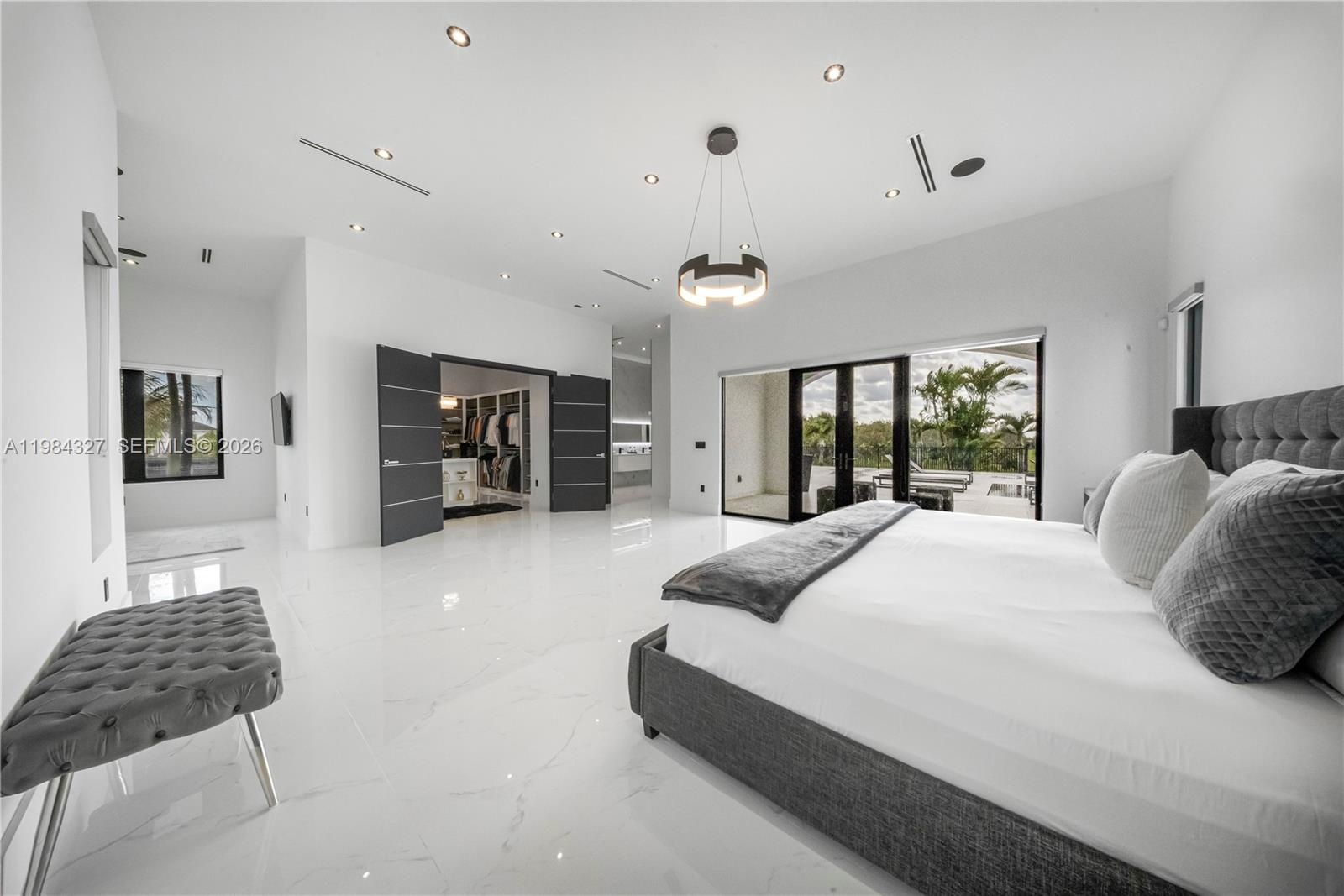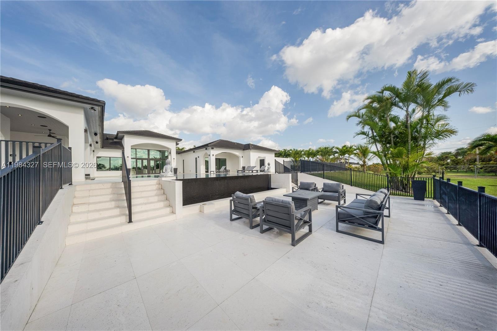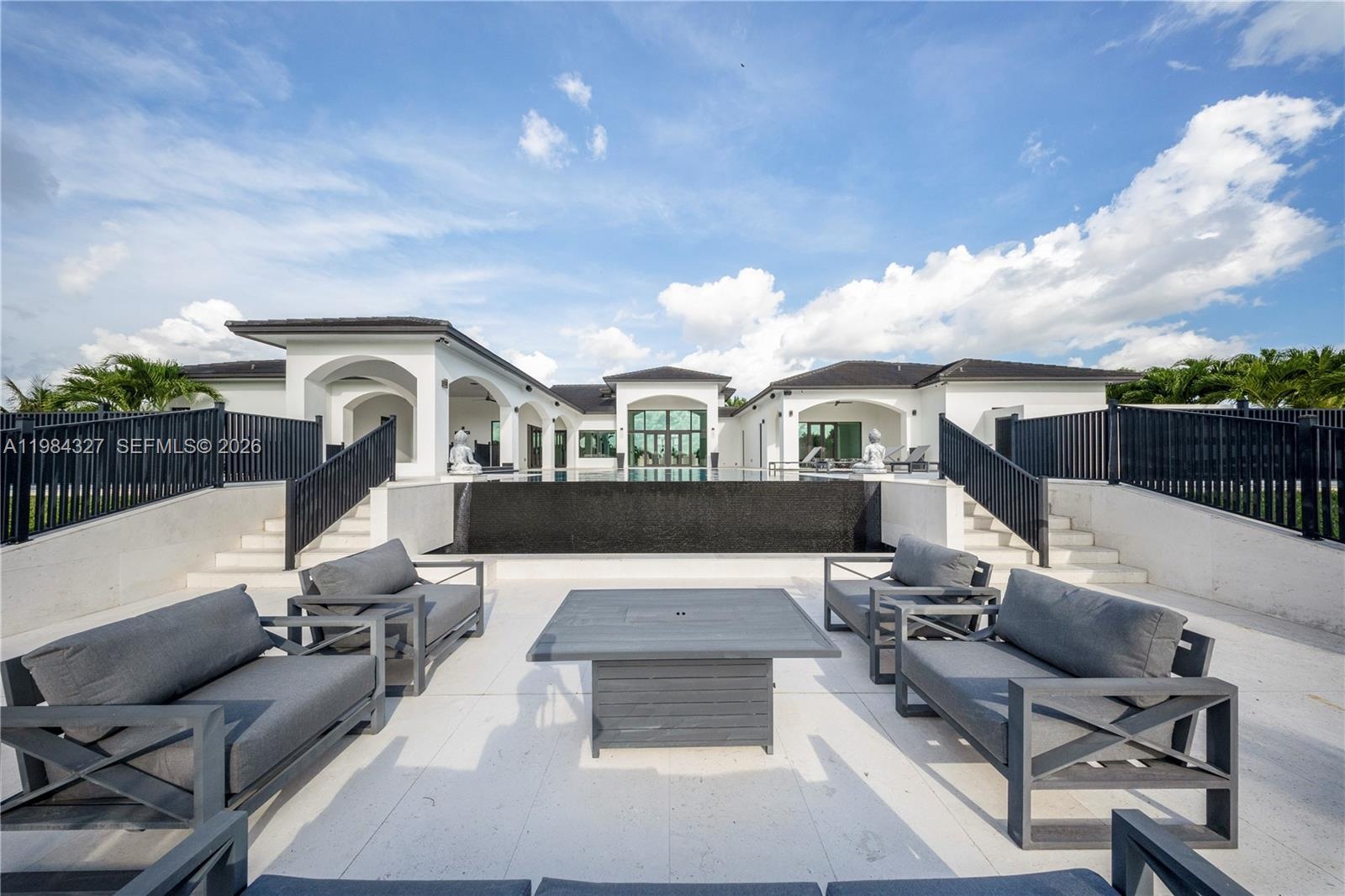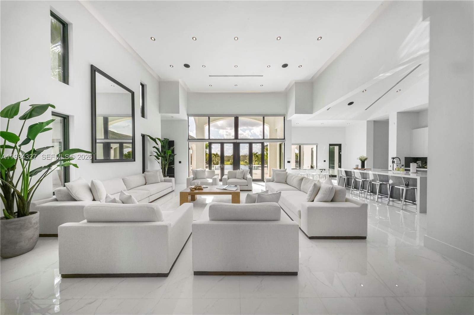 Welcome to Arrow Estate — a modern contemporary masterpiece on over 5 acres in Miami Dade County, near West Kendall and the Redlands. Built in 2023, this architectural gem offers 7 bedrooms, 6 bathrooms, and over 8626 sq ft, 11,835 adjusted sq ft, within 15,391 total sq ft under roof. A grand double-height foyer with 17-ft ceilings, floor-to-ceiling impact glass, and crystal chandeliers opens to expansive living areas and a chef’s kitchen with Liebherr refrigeration, Monogram appliances, induction cooktop, wine cooler, and oversized walk-in pantry. Bathrooms feature Duravit fixtures, smart mirrors, and bidet-equipped floating toilets. Ceramic tile floors run throughout, complemented by custom German doors. Four primary suites include spa-style baths, rainfall showers, soaking tubs, and custom closets; the main suite offers a lounge and pool access. Additional spaces include an office, media room, family room, art studio, and full laundry with LG appliances. Outdoors, enjoy a 20x40 infinity pool, sunken bar, built-in BBQ, and natural stone terraces ideal for entertaining. The property also features a 6-car garage, barn with kitchen and bath, casita, and multiple structures with future guest potential, plus 355 tropical fruit trees producing with AG exemption, a gas-powered generator with a 1,200-gallon tank, and no HOA.