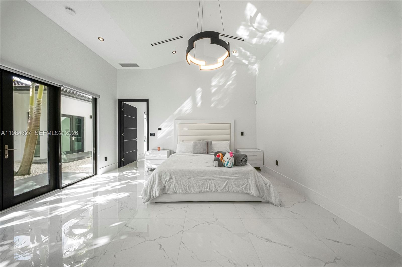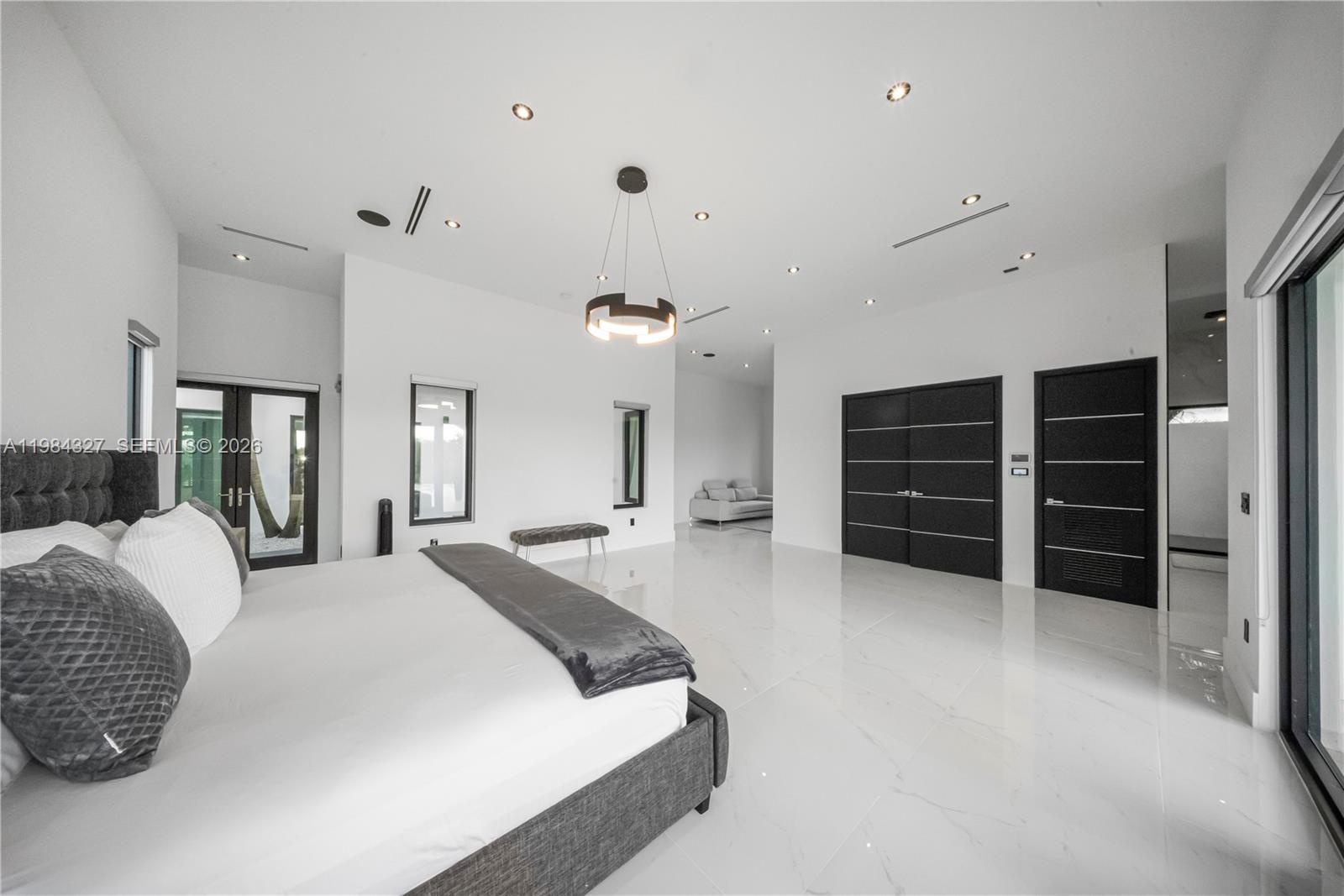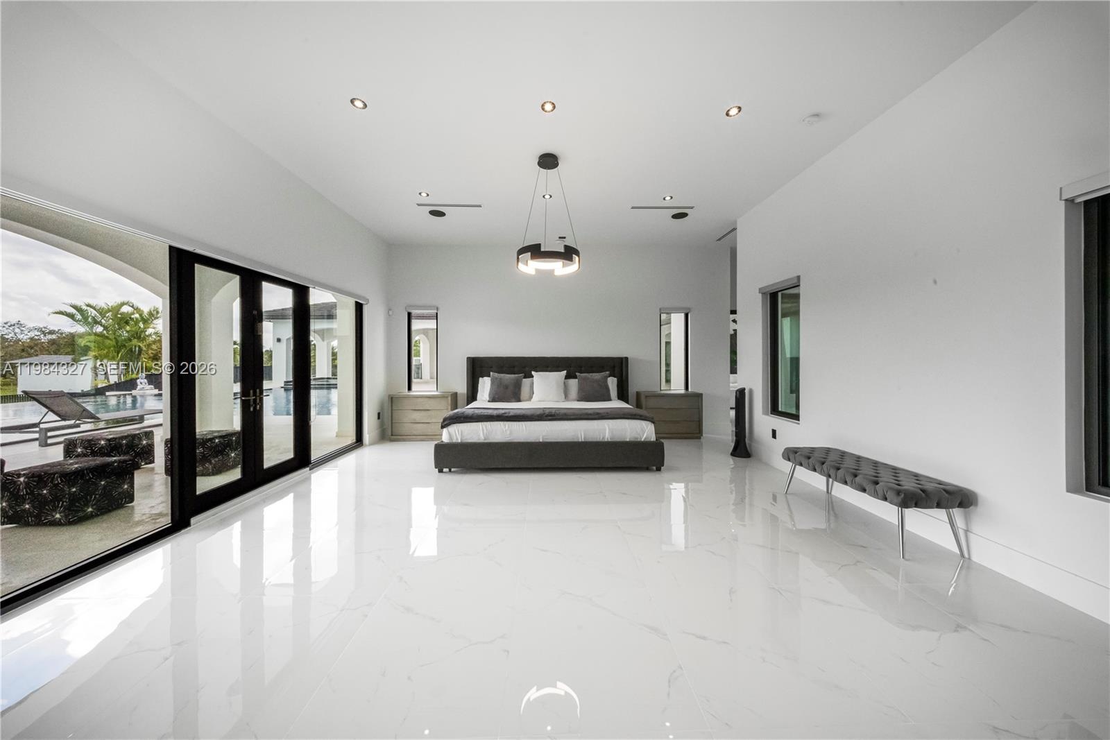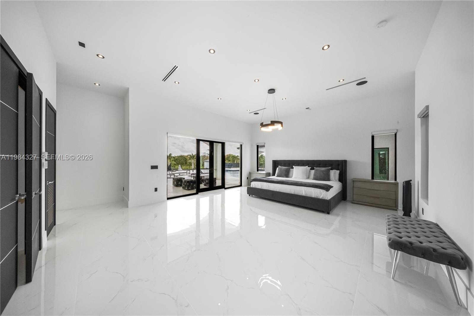 Welcome to Arrow Estate — a modern contemporary masterpiece on over 5 acres in Miami Dade County, near West Kendall and the Redlands. Built in 2023, this architectural gem offers 7 bedrooms, 6 bathrooms, and over 8626 sq ft, 11,835 adjusted sq ft, within 15,391 total sq ft under roof. A grand double-height foyer with 17-ft ceilings, floor-to-ceiling impact glass, and crystal chandeliers opens to expansive living areas and a chef’s kitchen with Liebherr refrigeration, Monogram appliances, induction cooktop, wine cooler, and oversized walk-in pantry. Bathrooms feature Duravit fixtures, smart mirrors, and bidet-equipped floating toilets. Ceramic tile floors run throughout, complemented by custom German doors. Four primary suites include spa-style baths, rainfall showers, soaking tubs, and custom closets; the main suite offers a lounge and pool access. Additional spaces include an office, media room, family room, art studio, and full laundry with LG appliances. Outdoors, enjoy a 20x40 infinity pool, sunken bar, built-in BBQ, and natural stone terraces ideal for entertaining. The property also features a 6-car garage, barn with kitchen and bath, casita, and multiple structures with future guest potential, plus 355 tropical fruit trees producing with AG exemption, a gas-powered generator with a 1,200-gallon tank, and no HOA.