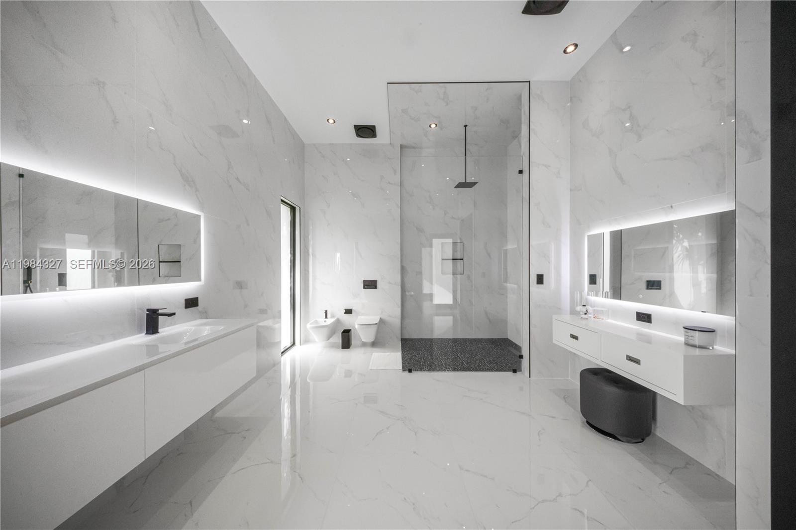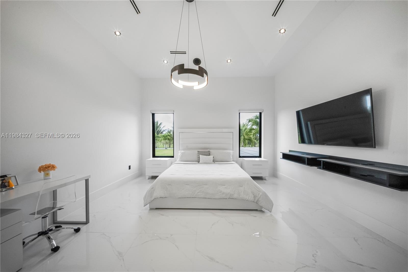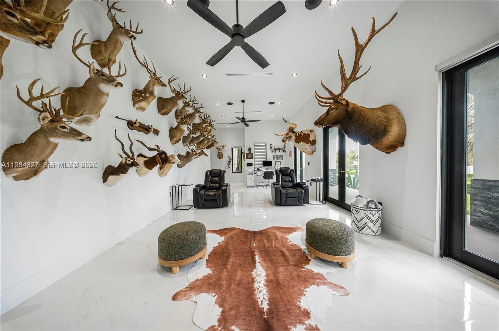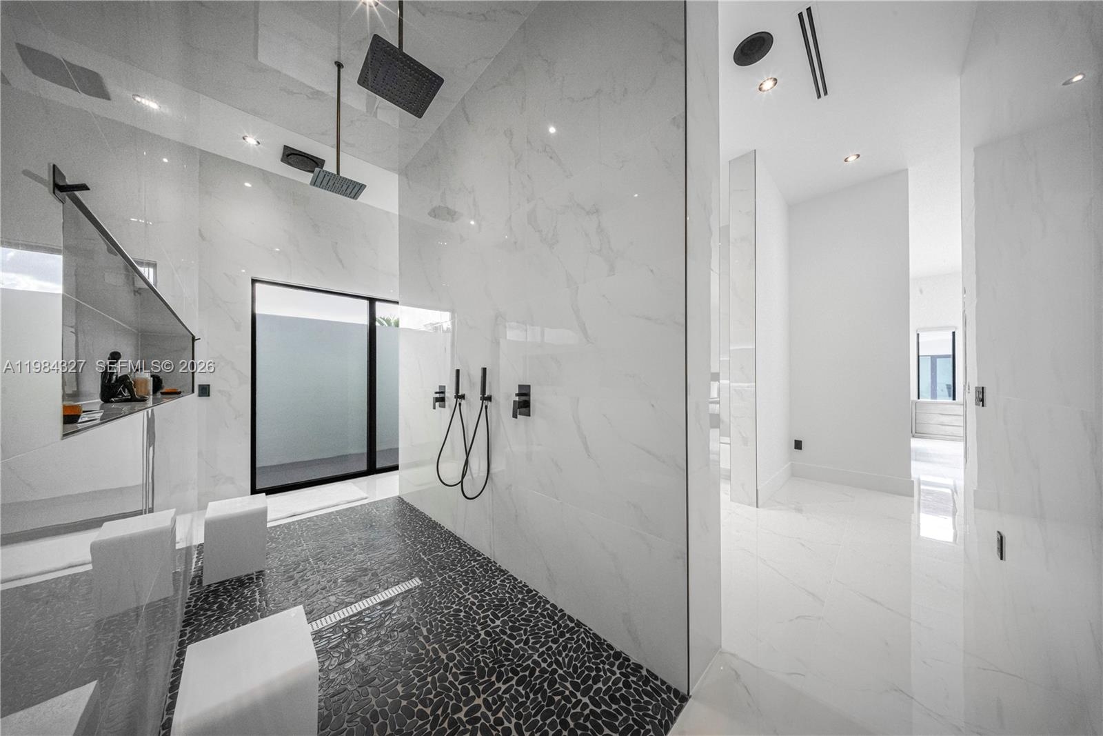 Welcome to Arrow Estate — a modern contemporary masterpiece on over 5 acres in Miami Dade County, near West Kendall and the Redlands. Built in 2023, this architectural gem offers 7 bedrooms, 6 bathrooms, and over 8626 sq ft, 11,835 adjusted sq ft, within 15,391 total sq ft under roof. A grand double-height foyer with 17-ft ceilings, floor-to-ceiling impact glass, and crystal chandeliers opens to expansive living areas and a chef’s kitchen with Liebherr refrigeration, Monogram appliances, induction cooktop, wine cooler, and oversized walk-in pantry. Bathrooms feature Duravit fixtures, smart mirrors, and bidet-equipped floating toilets. Ceramic tile floors run throughout, complemented by custom German doors. Four primary suites include spa-style baths, rainfall showers, soaking tubs, and custom closets; the main suite offers a lounge and pool access. Additional spaces include an office, media room, family room, art studio, and full laundry with LG appliances. Outdoors, enjoy a 20x40 infinity pool, sunken bar, built-in BBQ, and natural stone terraces ideal for entertaining. The property also features a 6-car garage, barn with kitchen and bath, casita, and multiple structures with future guest potential, plus 355 tropical fruit trees producing with AG exemption, a gas-powered generator with a 1,200-gallon tank, and no HOA.