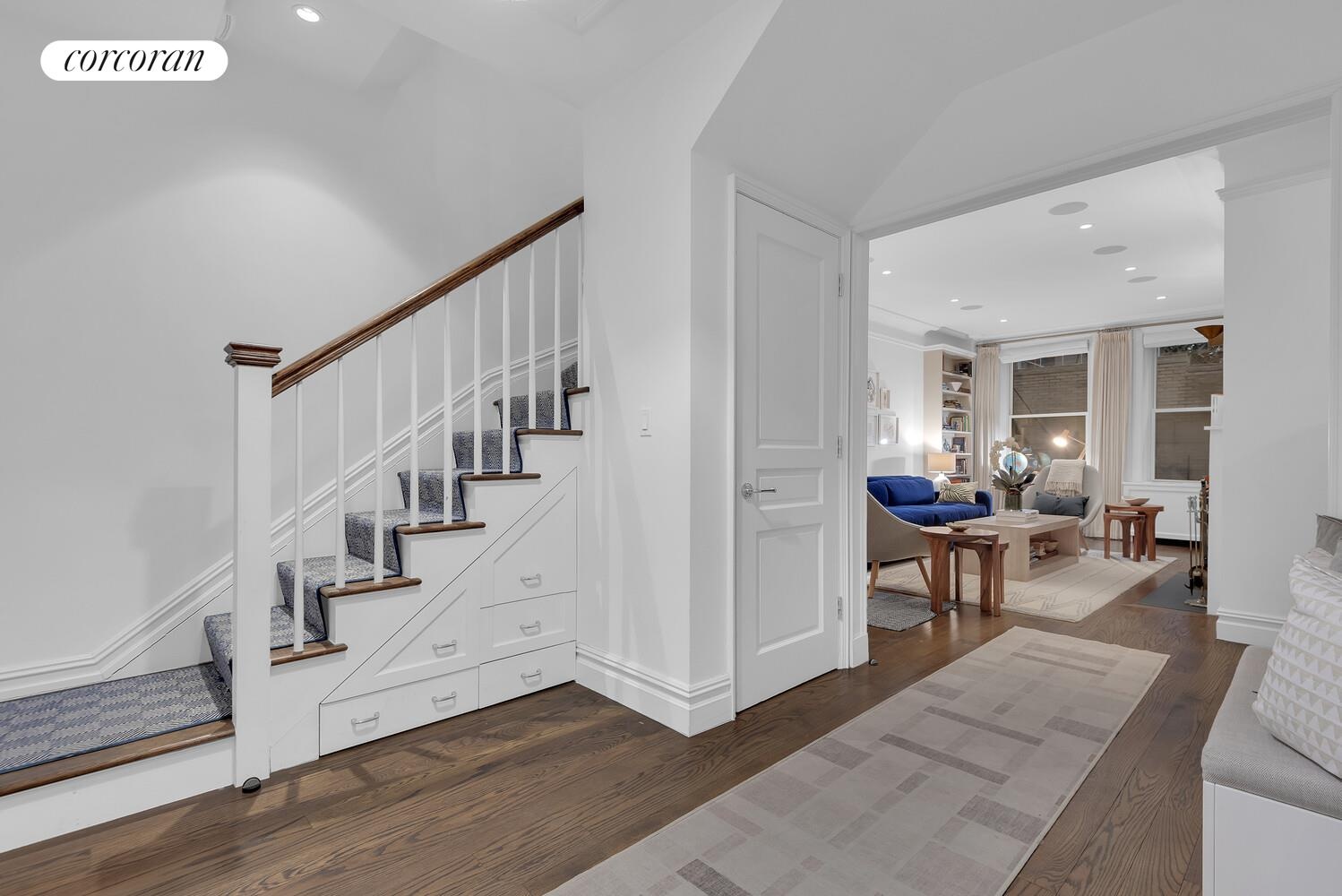 Upon entering, there is a sense of a townhouse parlor floor, with all common space for entertaining on the first level of this spacious duplex, offering an open and airy atmosphere. The first floor living room is complete with one of 3 wood burning fireplaces and is connected to a large formal dining area including be-spoke built ins in each room for ample storage.