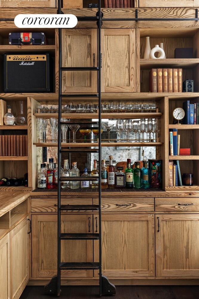 Bespoke details further elevate the home, including a striking hand-crafted staircase and railing, a custom built-in floor-to-ceiling library bar, blackout shades in the bedrooms, and a one-of-a-kind speakeasy, adding even more to the unique character of this home. Abundant storage throughout, including a double-height closet and hidden under-stair storage, enhances both functionality and livability. The custom-designed kitchen is elegantly appointed with porcelain Sapienstone countertops, a full suite of Thermador appliances, and a built-in wine refrigerator-every detail has been considered to elevate daily living. The primary suite offers a peaceful retreat, featuring a double vanity and sophisticated finishes.