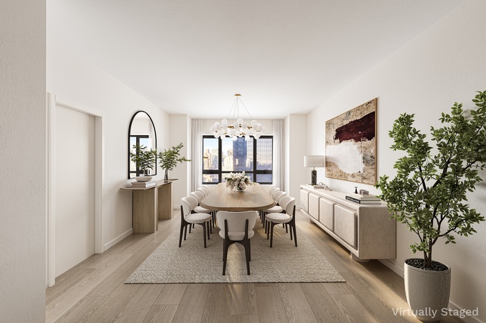 The apartment features triple exposures, 9-foot ceilings, and a dramatic living and entertaining space spanning approximately 65 feet and bathed in natural light from both north and south exposures. At the northern side, an oversized terrace provides a seamless extension of the living space-ideal for morning coffee, sunset views, or elegant entertaining.