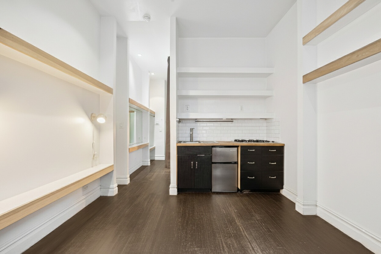 The interior has been intelligently customized to maximize both comfort and functionality. A custom-built platform bed creates a defined sleeping area while maintaining a seamless flow into the living space, offering privacy without sacrificing openness. Built-in shelving and integrated storage solutions line the walls, providing ample room for organization and display. Wood accent walls add texture and a rustic, modern charm, creating a cozy yet elevated aesthetic. The open kitchen layout blends effortlessly into the main living area, making it ideal for everyday living, while the elegantly tiled bathroom completes the home with clean, refined finishes. The building offers additional convenience with no board approval required, a live-in superintendent, and a pet-friendly policy.