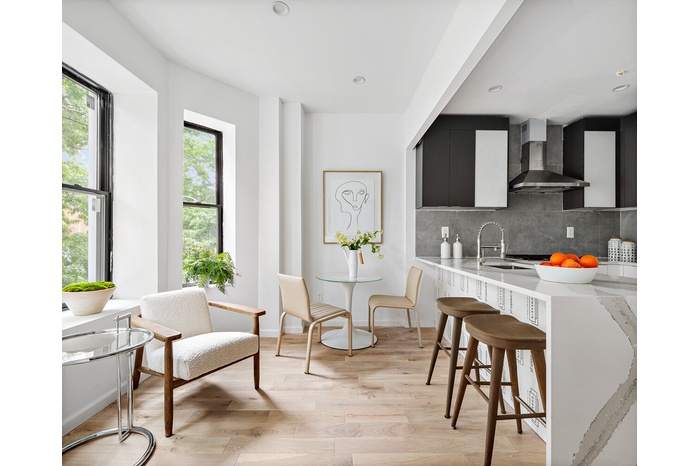Introducing the top-floor residence at 702 Greene Avenue, set within a classic four-story townhouse with a refined, modern white facade on a quiet, tree-lined block in Stuyvesant-Heights.