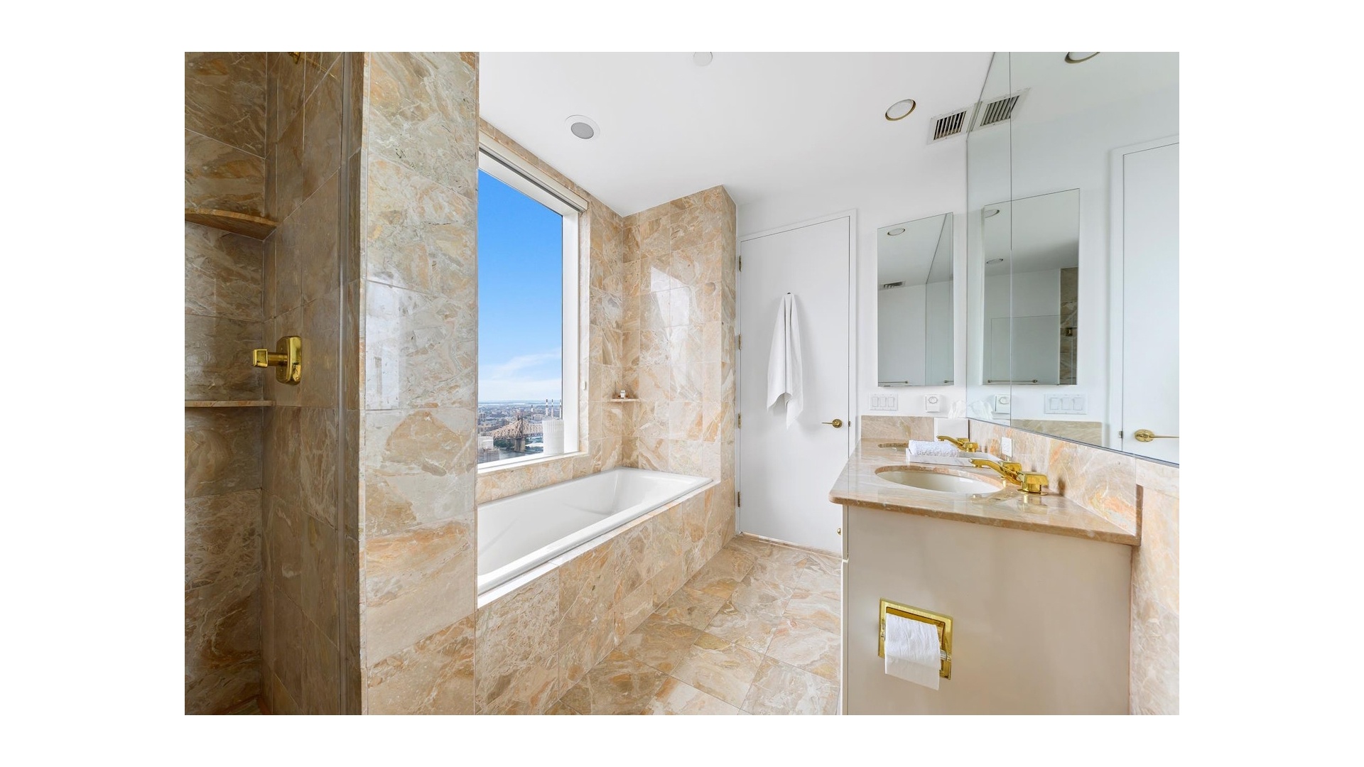 The generously sized primary suite boasts dramatic views and a luxurious windowed en-suite bath featuring dual sinks, a large shower, and a deep soaking tub. The corner second bedroom enjoys equally stunning vistas, high ceilings, and elegant hardwood floors. The second bath offers a spacious vanity and a marble shower stall.