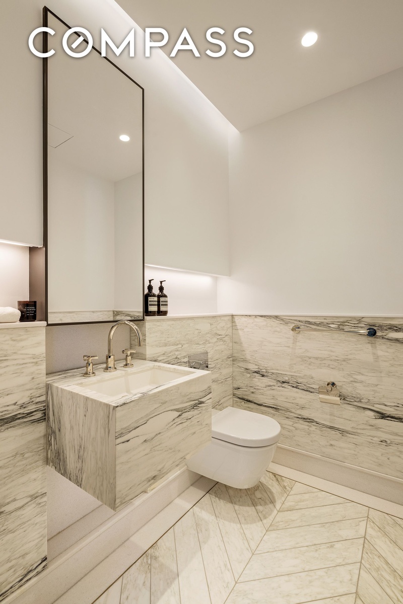 The primary suite is defined by its expansive views of the NYC skyline. There is generous storage, including a substantial walk-in closet. The statement bathroom features a luxurious soaking tub with majestic Manhattan views and appointed with Arabescato Vagli Oro and Saint Laurent marble. Radiant heated floors, glass-enclosed shower, and bespoke double vanity create a private wellness experience.