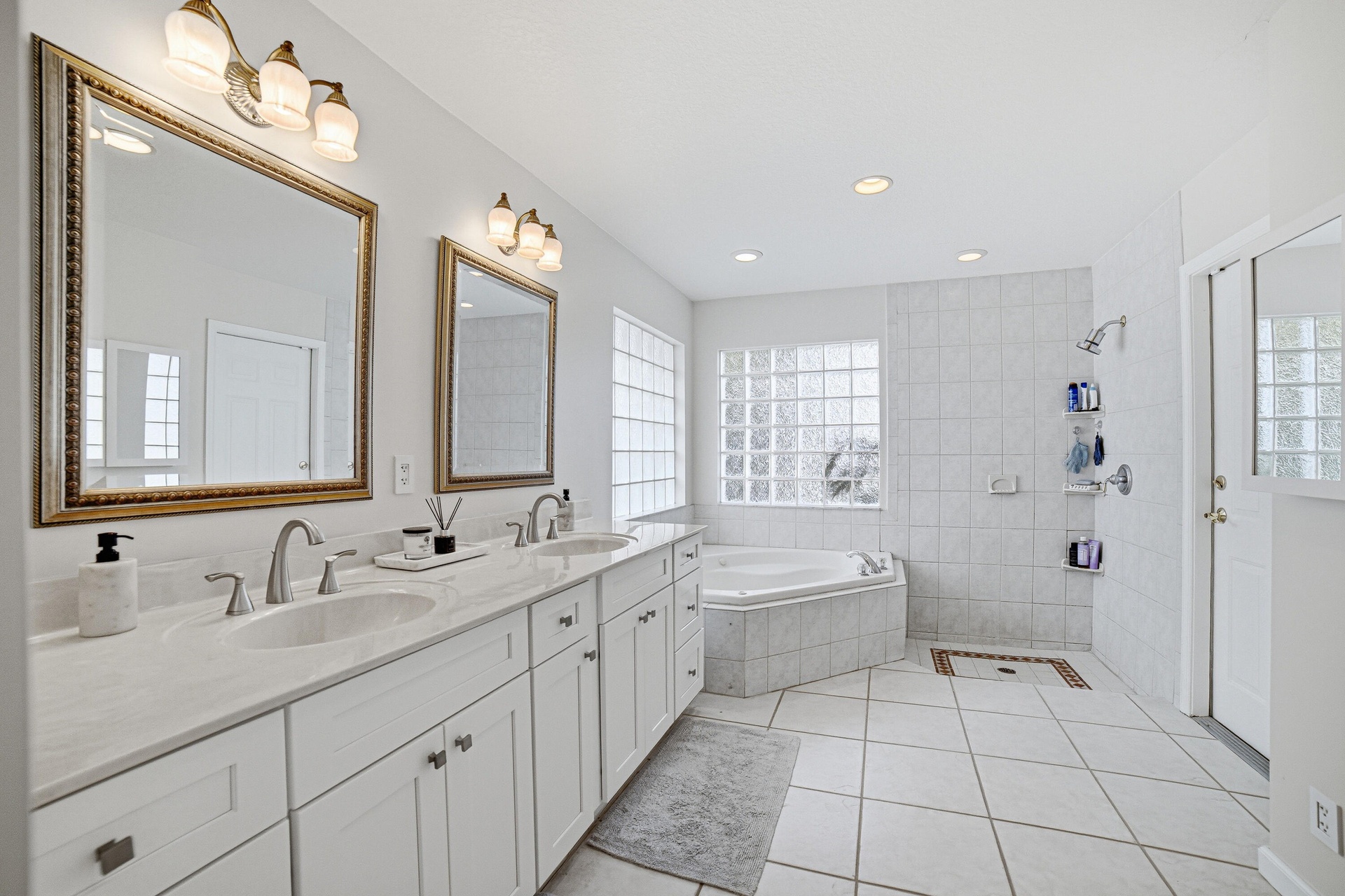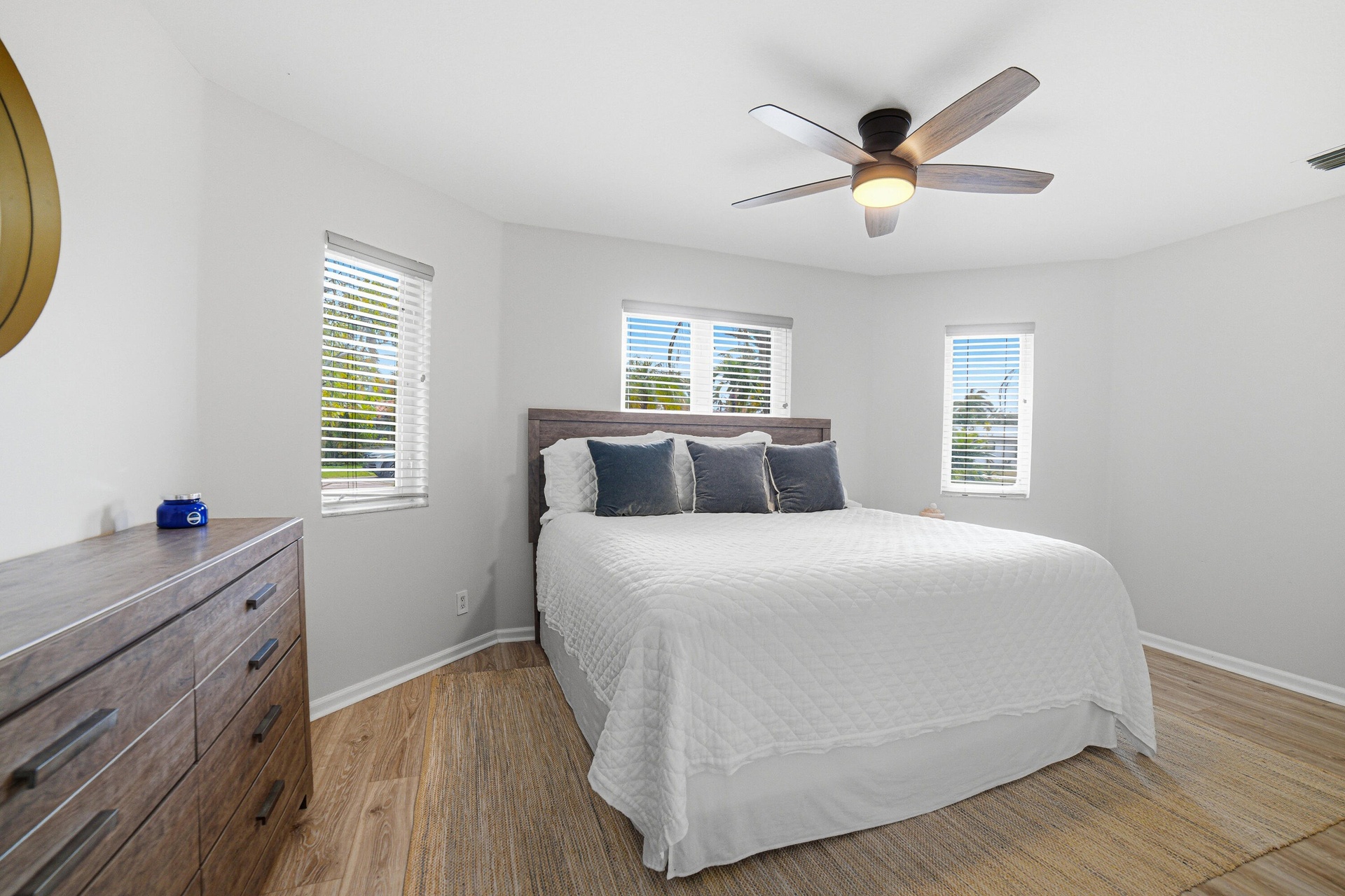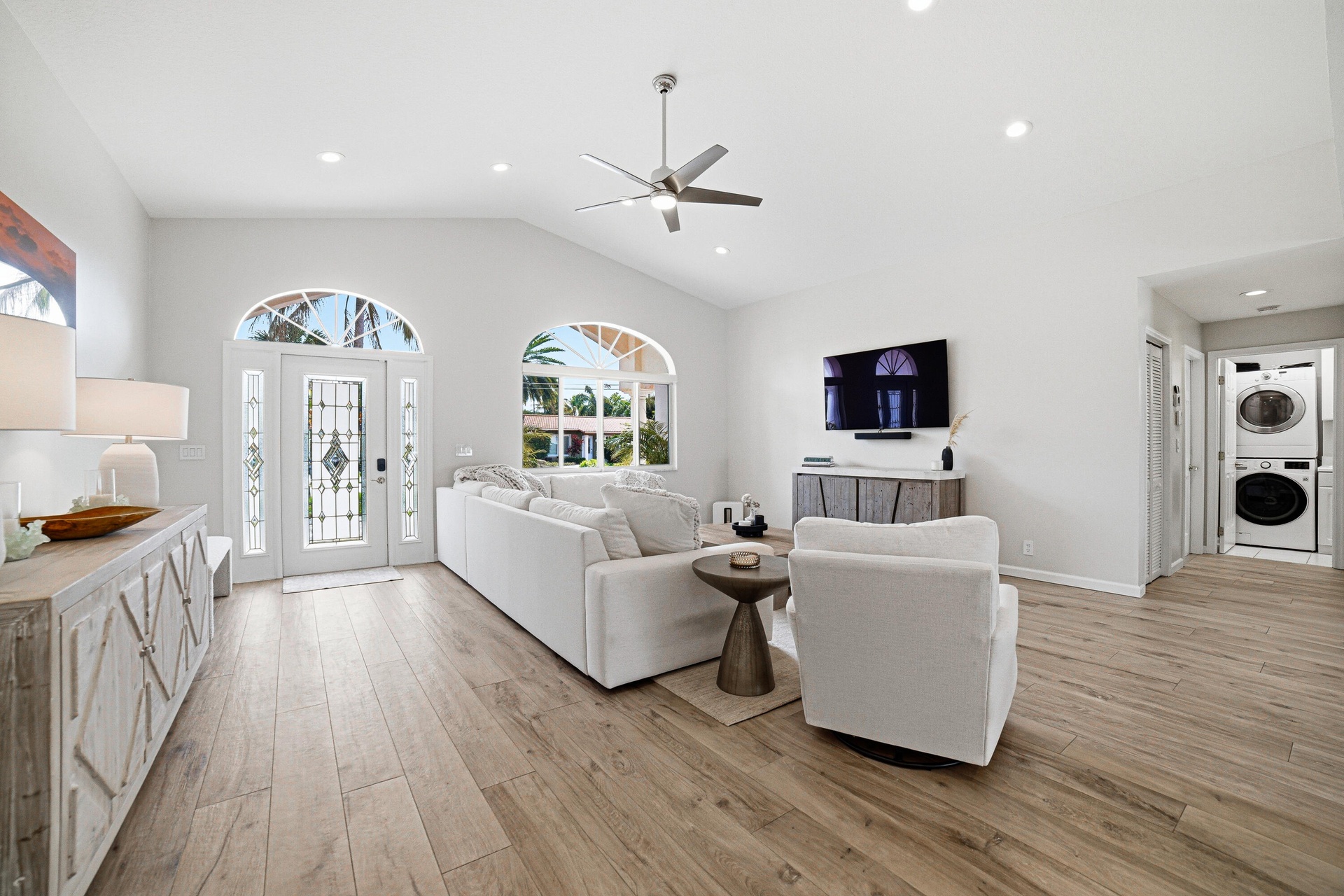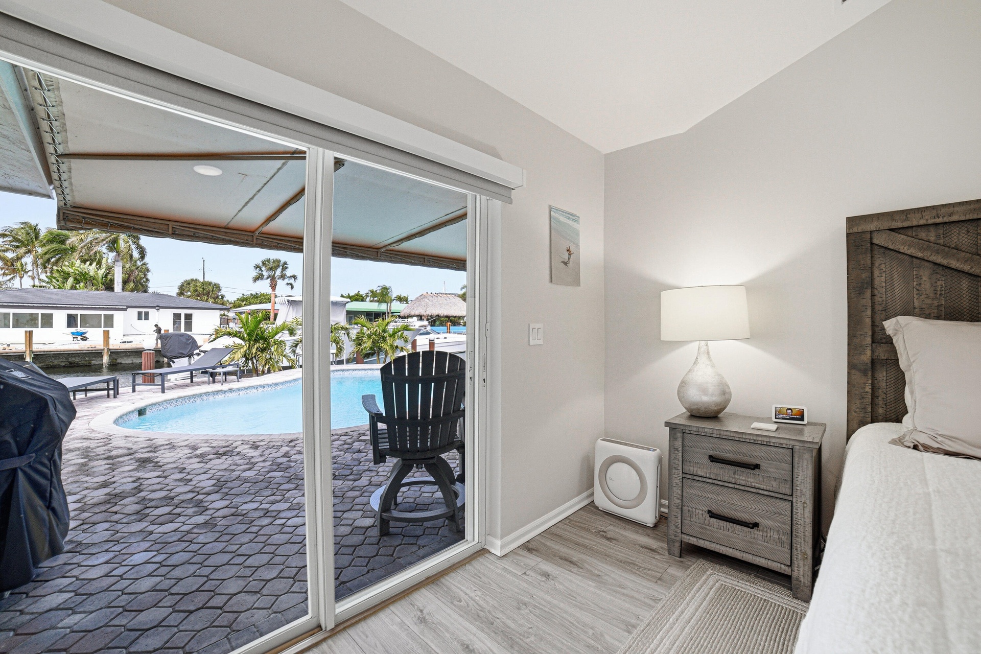 This renovated 3BR / 3.5BA home offers soaring 12' ceilings, a bright open layout, granite countertops, and solid wood cabinetry. Each bedroom features its own private bath and walk-in closet, plus a separate powder room for guests. The spacious primary suite opens directly to the pool and dock and includes dual sinks, a jacuzzi tub, and walk-in shower.