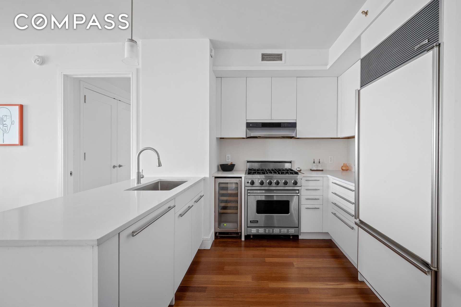 The open living and dining area is designed for both comfort and entertaining, seamlessly connected to a chef's kitchen outfitted with Viking, Sub-Zero, and Miele appliances, Pietra di Bedonia stone countertops, and a built-in wine cooler. The primary suite features an en-suite bath, generous closet space, and exceptional harbor light. The second bedroom functions fully as either a serene home office or a proper guest bedroom with dedicated full bath access — with an in-unit washer/dryer rounding out the home's practical conveniences.