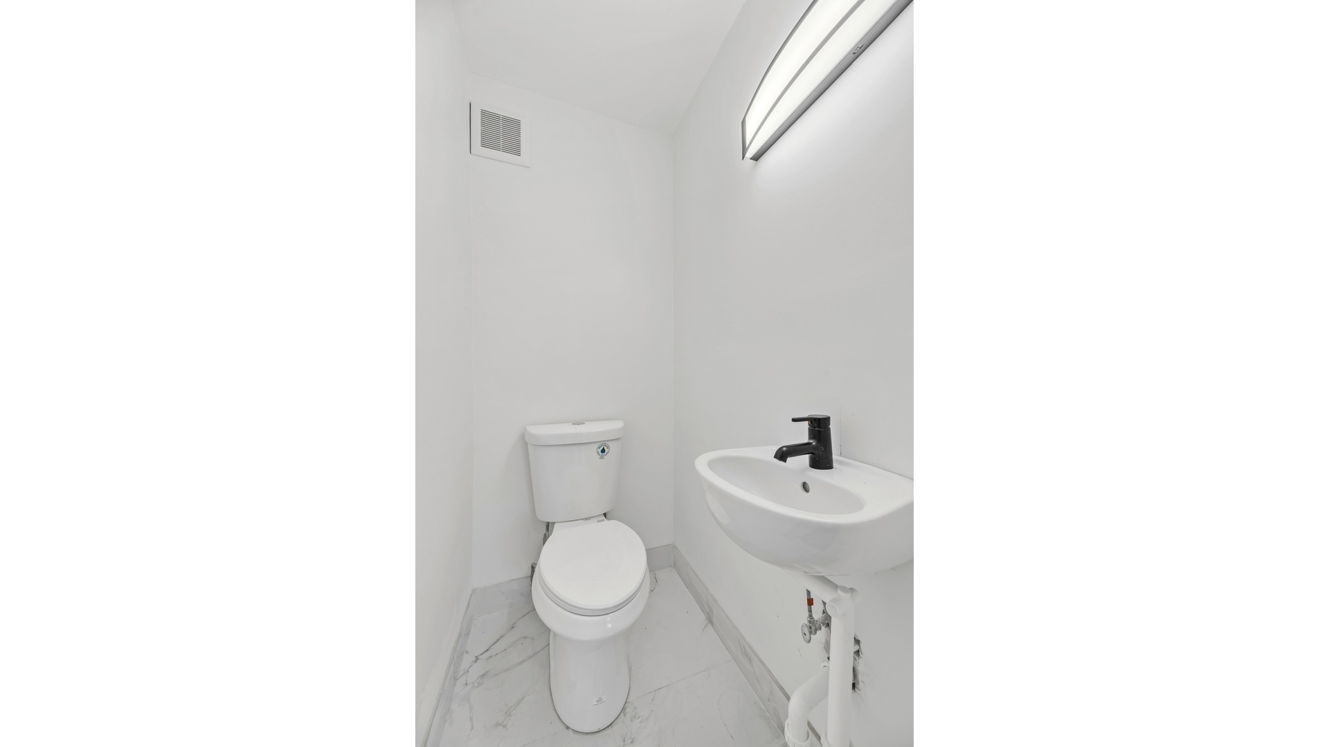 The primary bedroom offers a generous layout with dual windows, a ceiling fan, a spacious walk-in closet with hanging rods and a half bathroom with marble tile floors and matte black faucet.