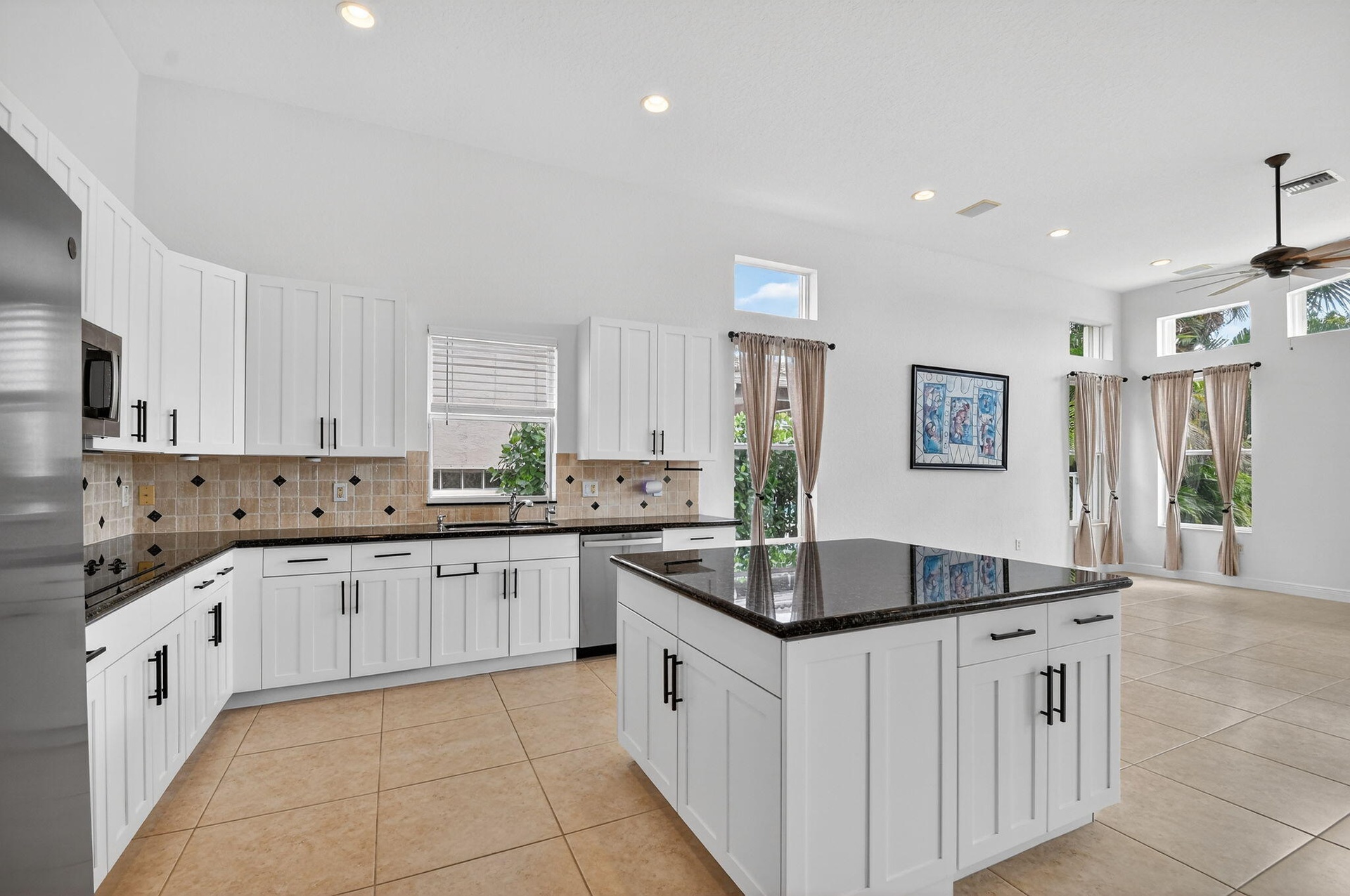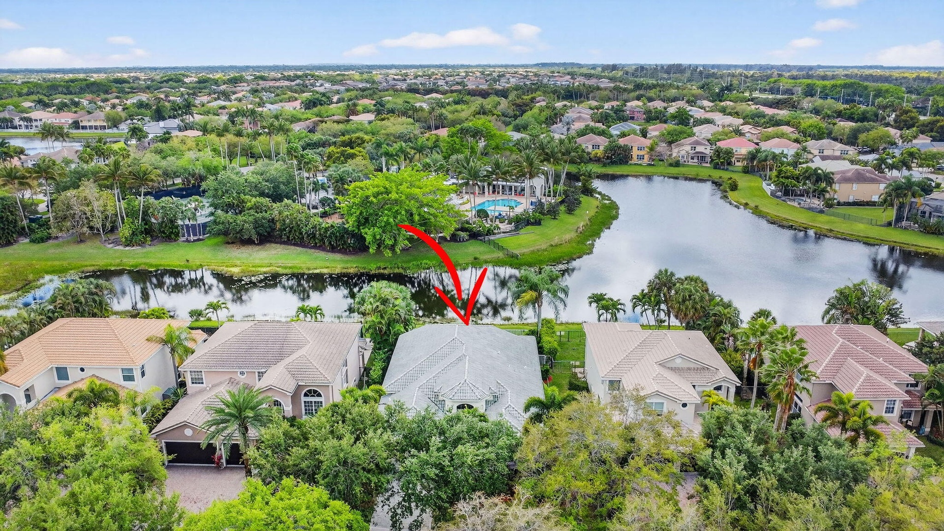 This inviting one-story home offers 3 bedrooms + office and 2.5 baths with a bright, open layout and volume ceilings with crown molding. Features include high-hat lighting, neutral tile. The kitchen boasts a large island, freshly painted cabinetry, granite countertops, marble backsplash, and stainless steel appliances. Spacious primary suite with 2 walk-in closets. Enjoy lake views from main living areas. Screened patio and private pool create ideal outdoor living. Well-maintained and move-in ready with 2025 AC and 2025 water heater, hurricane protection, and a clean, meticulously cared-for interior.