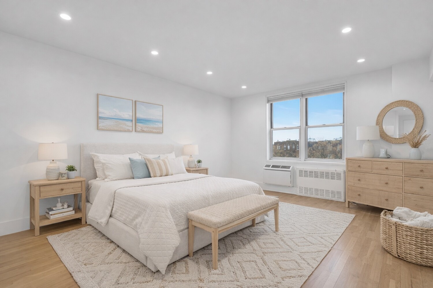 Upon entering, you're greeted by an expansive living and dining area that provides an ideal setting for both sophisticated entertaining and everyday living. Oversized west exposed windows invite sunlight to pour into the home while framing serene views of the iconic tree-lined Ocean Parkway promenade.