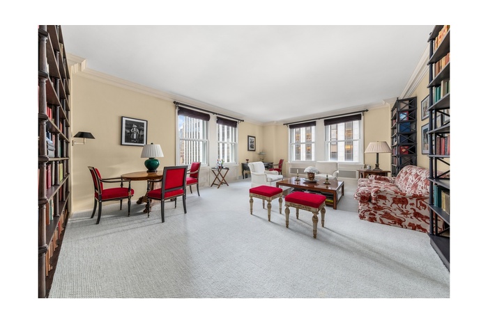 The expansive living room is both grand and inviting, distinguished by soaring ceilings, refined crown moldings, and four oversized windows that bring in exceptional natural light throughout the day. Perfectly suited for both entertaining and everyday living, the space reflects timeless New York sophistication. The stately south-facing bedroom offers a serene and private retreat, complete with a large walk-in closet and an en suite marble bath featuring a separate soaking tub and shower, enhanced by beautifully preserved original Art Deco fixtures that celebrate the building's architectural heritage.