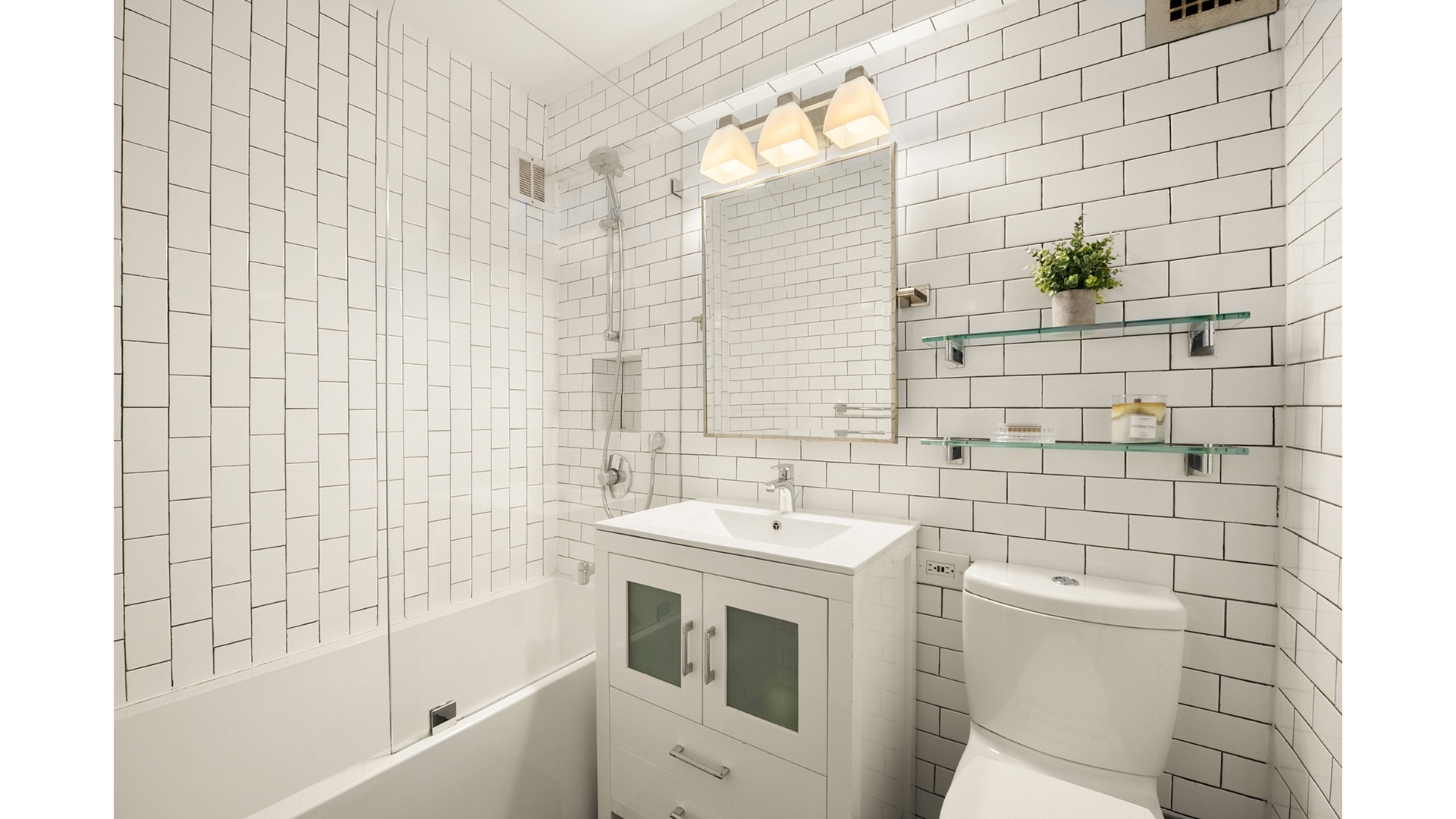 The spa-inspired bathroom is finished with floor-to-ceiling white subway tile, a deep soaking tub with a glass partition, Grohe fixtures, a Toto toilet, a white granite vanity, and grey slate flooring-clean, calming, and timeless with just the right amount of polish.