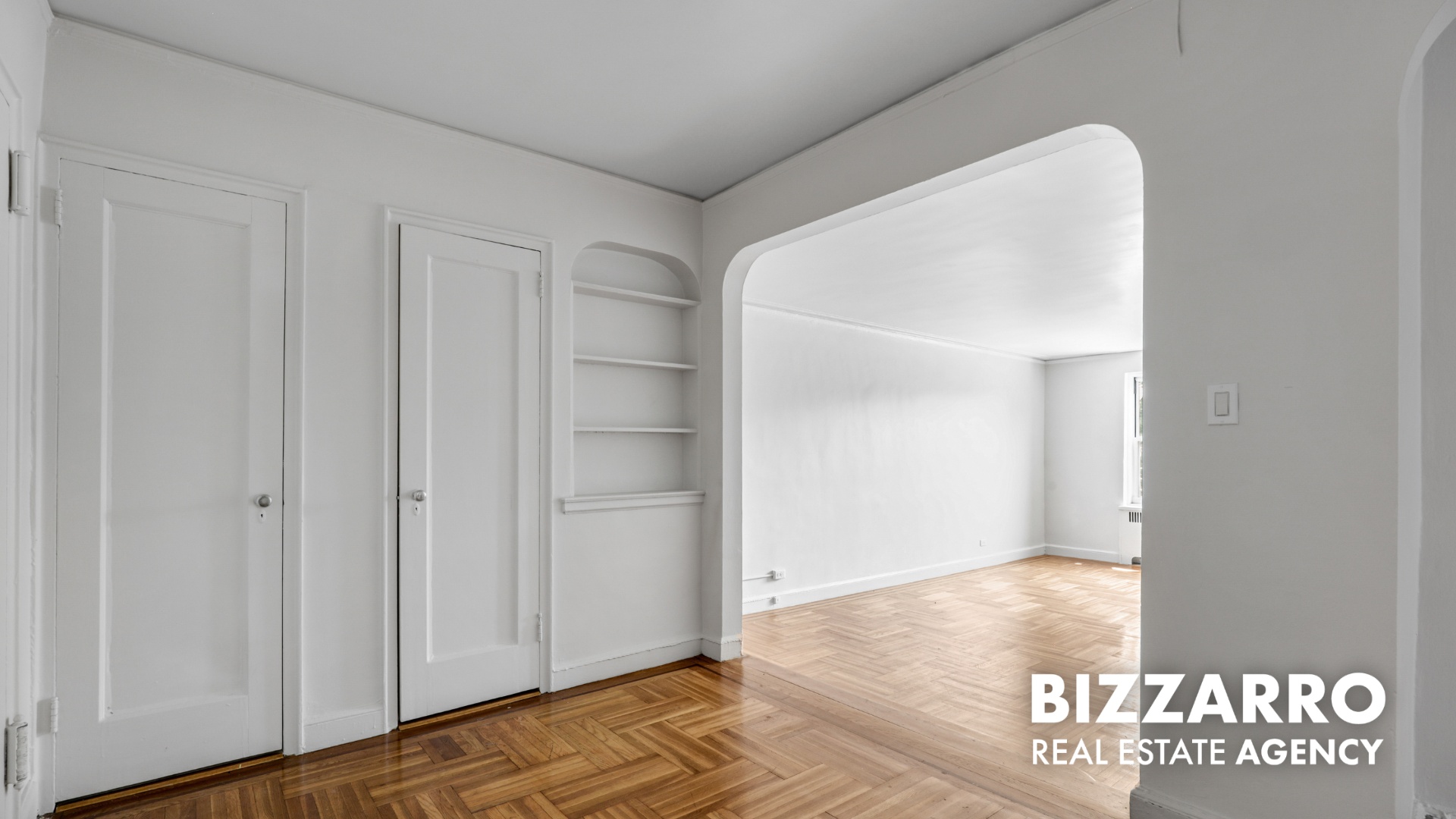 Entering the spacious foyer with its two closets and book nook, the unique appeal of this airy co-op becomes readily apparent. Lovely hardwood floors with walnut inlay are complemented by arched entries and crown molding. An updated walk-through kitchen with stone counters is positioned between the foyer and a large dining room that could be used alternately as a work-from-home space or other flex use.