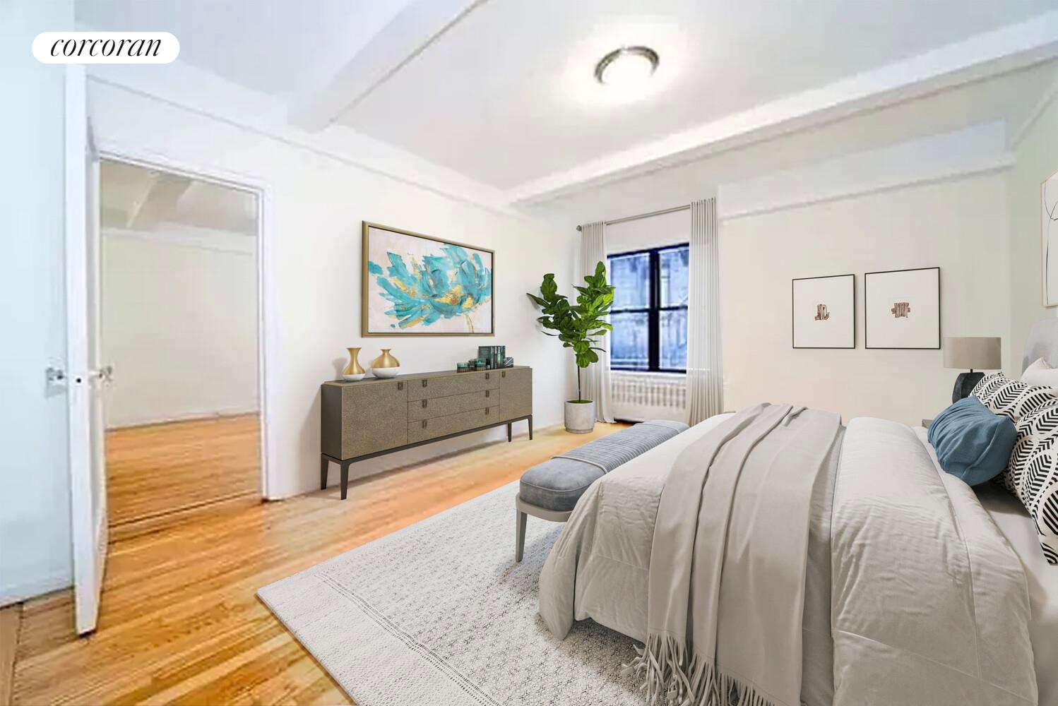 Perched high above 72nd Street off of Central Park West on the 9th floor, this spacious one bedroom, one bath home awaits your creative touch. The galley kitchen features a dishwasher and can be opened to the living room. A washer/dryer can be installed with board approval. Beamed ceilings, prewar details, abundant closet space and hardwood floors throughout complete the picture.