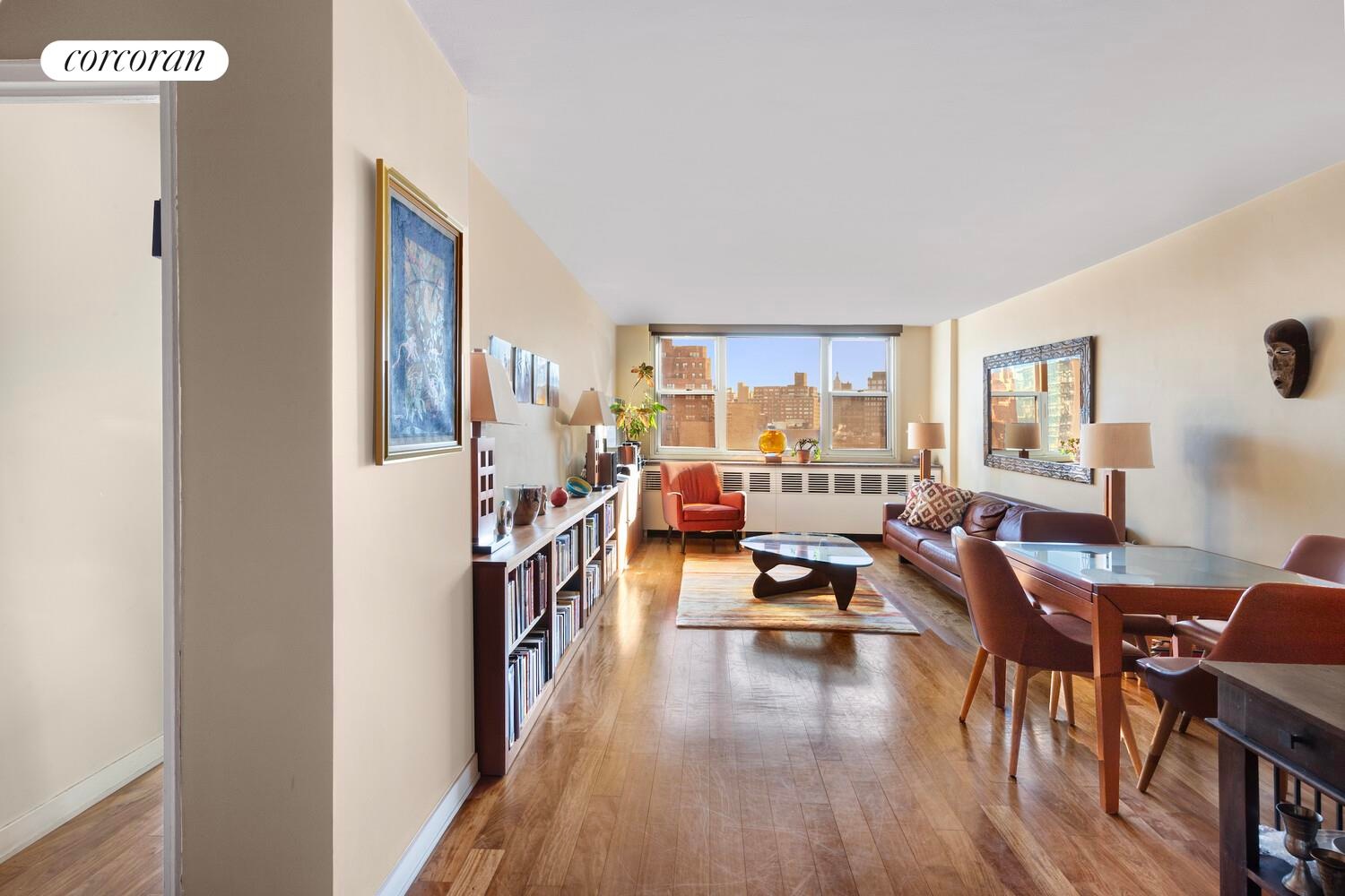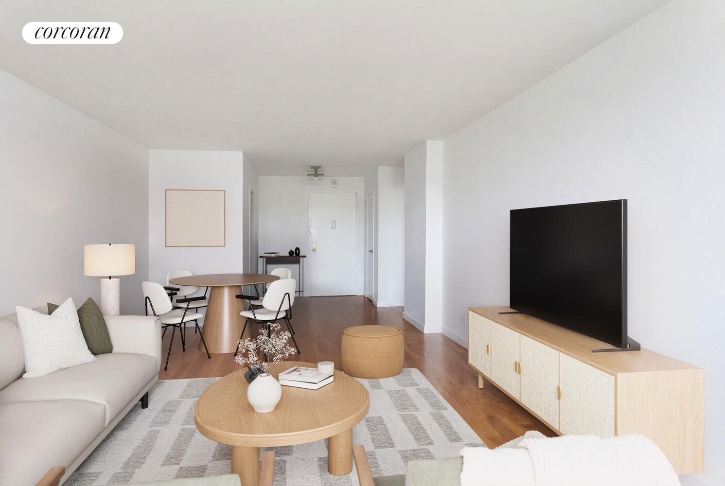 The generously proportioned living room features a dedicated dining area, making it ideal for both entertaining and everyday living. Rich mahogany floors run throughout the apartment, complementing the bright and airy living space. The kitchen is outfitted with Corian countertops with new stainless-steel appliances.
