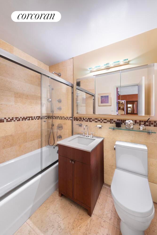 The spacious bedroom easily accommodates a king-size bed and features large custom closets, with additional space for a desk or workspace. The marble bathroom features a clean, timeless design.