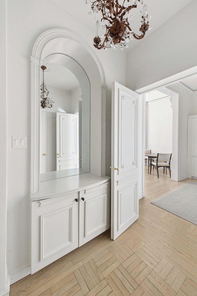 A gracious entry vestibule with two coat closets leads through tall French doors into a refined reception gallery and an impressively scaled living room. With soaring ceilings over eleven feet high, beautiful pre-war details, and a striking decorative marble fireplace, the living space is both dramatic and inviting, easily accommodating entertaining and dining. A large arched window frames the view and floods the room with natural light throughout the day.