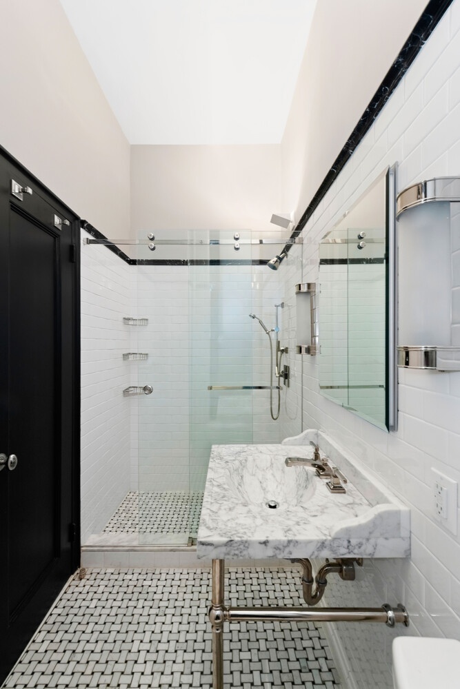 The thoughtfully designed, windowed kitchen is tucked away and features custom cabinetry, stone countertops, and high-quality appliances, offering excellent functionality while remaining discreetly separated from the living area. A corridor provides privacy between the public and private spaces of the home and leads to the exceptionally quiet bedroom. The windowed marble bathroom is finished with classic materials and a glass-enclosed shower.