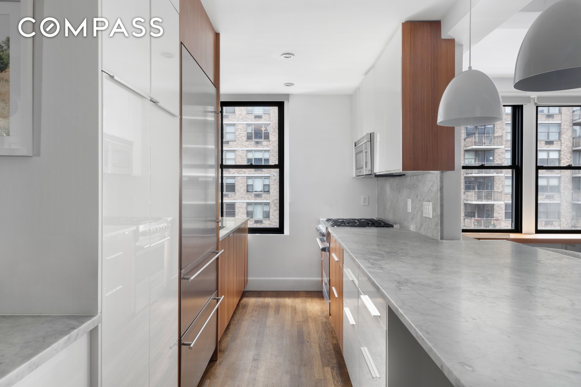 Bathed in natural light from its high-floor perch, the home features a gracious foyer that opens into an elegant layout flowing seamlessly between the expansive living and dining areas and the open, windowed chef’s kitchen. The kitchen is impeccably designed with custom cabinetry, Carrera marble counters and backsplash, a large peninsula with seating for four, and top-of-the-line appliances including a Viking range and microwave, Bosch dishwasher, and Liebherr refrigerator with dual freezer drawers. A custom built-in bar off the living room provides the perfect touch for entertaining.