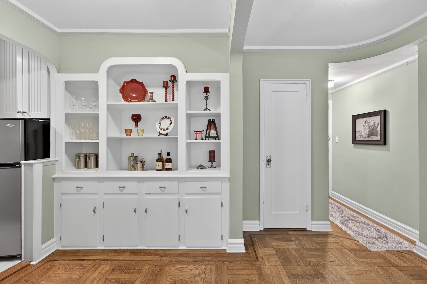Gracious and spacious pre war corner one bedroom featuring classic Art Deco architectural details, including a step down living room, elegant arched entryways, hardwood floors, and soaring high ceilings.