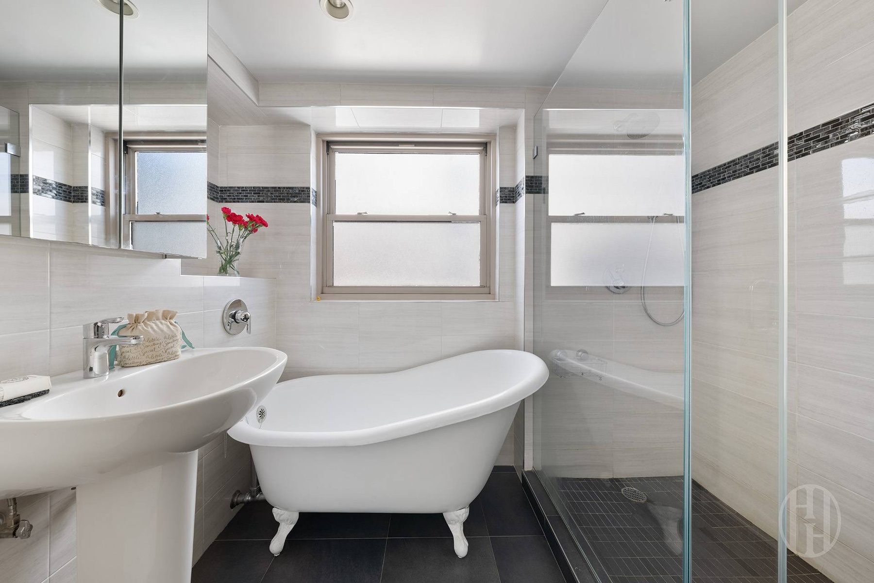 The windowed bathroom feels like a private retreat, complete with both a shower and a stunning clawfoot soaking tub. These spa-like details add character and charm.